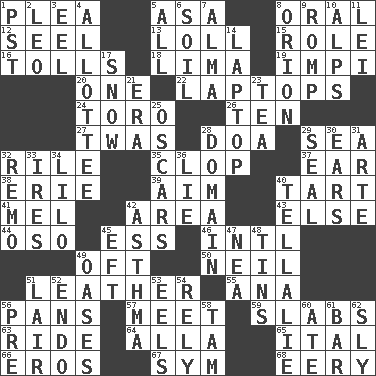 ACROSS 1. Entreaty 5. White ___ sheet 8. Spoken 12. Stitch closed the eyes of (a falcon) 13. Hang loosely or laxly 15. Hero or heavy, e.g. 16. For Whom the Bell _____ 18. Pale green bean 19. Body of Kaffir warriors 20. Single 22. Portable computers 24. "Corrida" creature 26. "___ Little Indians" 27. It was, poetically 28. ___ good deed 29. Ocean 32. Cause heat under the collar 35. Hoof sound 37. Hearing organ 38. One of the Great Lakes 39. Direct toward a target or goal 40. Small pie 41. Cartoonist voice _ Blanc 42. Length times width 43. Otherwise 44. Bear (Spanish) 45. Curvy letter 46. International (abbr.) 49. Often (poetically) 50. Famous astronaut Armstrong 51. Cordwainer's material 55. Santa ___, CA 56. Baking dishes 57. Rendezvous 59. Broad, flat, thick pieces 63. Travel on an animal 64. Silent film actress Nazimova 65. Slanted text style (abbr.) 66. Greek god of love 67. Symbol (abbr.) 68. Suggestive of the supernatural DOWN 1. Pacific Standard Time (abbr.) 2. Lion 3. Snakelike fish 4. One to whom something is allotted 5. 100% 6. Land 7. _ mater 8. Greek mythologigal hunter 9. Play 10. High mountains 11. Luau accessory 14. Portable computer 17. Frozen precipitation 21. Period 23. Beverage made from leaves 25. Motion picture awards 28. Realm 29. Lick closed 30. Hearing organs 31. Johnson of "Laugh-In" 32. San ____ (Riviera town) 33. Angers 34. _ and Stitch 36. Whopper 40. Copy Pinocchio 42. Respiratory problem 45. Newt 47. Teachers' org. 48. Metal containers 49. Fertile tracts in a desert 51. Den 52. Inside; within (prefix) 53. Snakelike fish 54. Depend 56. Before (prefix) 58. Scottish cap 60. Had dinner 61. Tavern 62. Roguish