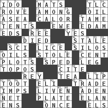ACROSS 1. Wedding promise 4. Floor protectors 8. Affectionate concern, for short 11. Be footloose 13. Amid 15. Lubricate 16. Toward the sea 17. Bodily heat indicating an inflammation 18. Not wild 19. Portable shelters 21. She-sheep 22. Dutch treat 23. Begley and Asner 24. To sift 27. Consenting reply 29. Passed on 30. Lacking originality or spontaneity 34. _-fi 36. Louse (plural) 39. Grain storage towers 40. Lubricates 41. Fur scarf 43. Penny 44. Ground plans 46. Broke a traffic law 47. Part of a journey 48. Traditional theme or motif 49. Quote 51. Marina Del _, California 53. Beverage made from leaves 54. Mouth edge 57. A blast of a horn 60. Biblical high priest 63. Swap 65. Naughty children 66. Make or become more lively 69. Arabian gulf 70. Remaining after all deductions 71. Food holder 72. Flair 73. Followers of ems 74. Single time 75. Raised railways DOWN 1. Feeling or showing extreme anger 2. Administered medicine 3. Baking chambers 4. Big _ 5. Nanny (var.) 6. Lacquered or enameled metalware 7. Overwhelm 8. Frog relative 9. Pale green bean 10. Clement's nick name 12. Ingest 14. Jennifer or Joel 18. A testis 20. Indian title of respect (Mr.) 25. Snakelike fish 26. Proofreads 28. Double-curved letter 29. What propaganda does 31. Toward shelter 32. Having great length 33. Eastern Standard Time (abbr.) 34. Grain storage tower 35. Hoof sound 37. Police officer (slang) 38. Choose 40. Elect 42. Singer Brickell 45. Compass dir. 50. Make lace 52. Sharp bark 54. Dipping utensil 55. Standard of perfection 56. Actor Sean's family 57. Prong on a fork 58. Sign of something about to happen 59. Chooses 61. _ and Stitch 62. "Terrible" tsar 64. Actress Charlotte 67. And so on (abbr.) 68. Born