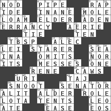 ACROSS 1. Allow head to fall sleepily 4. Corncob 8. Strike 11. Binary compound 12. Lacking in sense or substance 14. Undercover agent 15. Rich soil 17. A person who is older than you are 18. Arabian gulf 19. Tendancy to err 21. Nest on high 23. Standoff 24. "___ Little Indians" 25. Cook's measure (abbr.) 27. Actor Baldwin 30. Luau accessory 31. A viewer who gazes fixedly 34. Ocean 37. _ tizzy (2 wds.) 38. Leaves out 39. And not 40. It is 41. Makes clutter 43. Single 44. French philosopher Descartes 45. Crow sounds 47. RI univ. 49. _ Mahal 50. Snob 52. Legislator 56. Set down 57. Tree or shrub in the Birch family 60. Hero or heavy, e.g. 61. Globular water bottle used in Asia 62. Portable shelters 63. Lion 64. Had dinner 65. Relaxation 66. Greek goddess of the dawn DOWN 1. The longest river in the world 2. Scent 3. Letter starter 4. Component 5. Inwardly 6. Groovy apt. 7. Compass dir. 8. "The Thinker" sculptor 9. Toward shelter 10. Fenced enclosure 13. Period 14. Female horse 16. Floor coverings 20. Pinches, bites 22. And so on (abbr.) 25. Portable shelter 26. Prejudice 27. Ascend 28. Allows 29. Celtic language 30. Cards in a Roman deck? 32. Heavy book 33. So be it 34. Overwhelm 35. Immeasurably long periods of time 36. "We ___ not amused" (Victoria) 42. Examine hastily 44. _ de Janeiro 46. Partly open 47. Join together 48. Round or rotation of duties 49. Laconic 50. Notch 51. Make lace 52. Arranges properly for use 53. Lacquered or enameled metalware 54. Margarine 55. Vintage cars 56. Insect wing 58. Area sheltered from the wind 59. Heredity factor (abbr.)