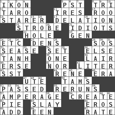 ACROSS 1. Visual representation of an object 5. Pacific Standard Time (abbr.) 8. Three (prefix) 11. Pacific island yam 12. Angers 13. Friend of Pooh 14. A viewer who gazes fixedly 17. Conveyance 19. Disco prop 21. Foolish or stupid persons 22. Hollow 23. Commissioned military rank (abbr.) 24. And so on (abbr.) 27. Habitations of wild animals 29. Mayday 32. Gospel singer Marvin 34. Put into a specified state 36. Otherwise 37. Hyperbolic tangent 38. Single 39. Den 40. Celtic language 41. And not 42. 61 cubic inches 43. Fast jet (abbr.) 44. French philosopher Descartes 46. Epoch 47. Shoshoni 50. Scottish caps 52. Went by 55. Summer TV shows 57. Electrical Measurement 59. Cause to be 62. Sliced dessert 63. Kill 64. Greek god of love 65. Say or write further 66. Car or cant ending 67. Pace DOWN 1. It is 2. Krazy ___ of comics 3. Mouths or openings 4. Compass direction 5. Before (prefix) 6. Major League Baseball Commissioner Bud 7. Sadhe (variant) 8. Musical group of three 9. Carrot, for example 10. Charged particles 12. Binary compound 15. Wear away 16. Hero or heavy, e.g. 18. Shallow baking pan 20. Gillaume's butler role 24. _____ Park, CO 25. Pulls apart 26. 2nd pers. sing. pres. of can (arch.) 28. Sir (Sp.) 29. Chalkboard 30. Flexible twig of a willow tree 31. Spanish missionary in California 33. A female animal or person 35. Cylindrical with tapered ends 36. Connecticut Ivy Leaguer 42. Arboreal primate 45. Drug cop 47. Purpose 48. Laconic 49. Peak District village in England 51. Scornful expression 52. Dad 53. Among 54. Drove too fast 55. Marina Del _, California 56. "Two Mules for Sister ____" 58. Separate the seeds from cotton 60. Small child 61. Compass dir.