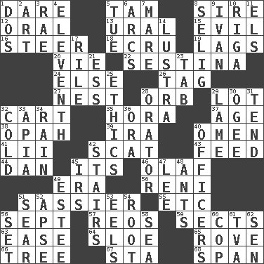 ACROSS 1. Have the gumption 5. Scottish cap 8. The founder of a family 12. Relating to the mouth 13. Mountain range 15. Morally bad or wrong 16. Navigate 18. Shade of tan 19. Fails to keep up a pace 20. Compete 22. French poetic form 24. Otherwise 26. Label 27. Egg locale 28. Globe 29. Car dealer's back yard 32. Heavy open wagon 35. Israeli folk dance 37. Grow older 38. Brightly colored fish 39. Lyricist Gershwin 40. Sign of something about to happen 41. Cards in a Roman deck? 42. Get outta here! 43. Nourish 44. One of the 12 tribes of Israel 45. ___ a Wonderful Life 46. Norwegian king 49. Epoch 50. Painter Guido (1575-1642) 51. More impudent 55. And so on (abbr.) 56. Back-to-school mo. 57. Vintage cars 59. Religious groups 63. Comfort 64. A type of plum 65. Be footloose 66. Family _ (genealogy) 67. R.R. building 68. Connect, as a bridge DOWN 1. Two (Sp.) 2. Nonscientific branch of learning 3. Actress Charlotte 4. Veterans Day date 5. Third day of the wk. 6. Arches 7. Female horse 8. Former Milwaukee Brewers owner Bud 9. _ the terrible 10. Port city in Latvia 11. Raised railways 14. A period of five years 17. Cause heat under the collar 21. Curvy letter 23. Bar bill 25. Value system 28. Speaker 29. Unable to walk 30. Double curve, resembling the letter S 31. Watch over 32. Having a low temperature 33. Capital of Western Samoa 34. Water falling in drops from the sky 36. Mouth or opening 40. Persons of authority 42. Flight of steps 45. Big collection agency 47. Area sheltered from the wind 48. Pismires 49. First name in cosmetics 51. Burn superficially 52. Domed church section 53. Snakelike fish 54. Carrot, for example 56. Arrange properly for use 58. Ocean 60. Police officer (slang) 61. Federal power corp. 62. Elected rep.