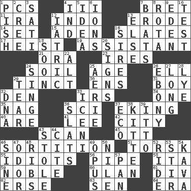 ACROSS 1. Personal Computers (abbr.) 4. One more than two 7. Cy Young winner Saberhagen 11. Retirement account (abbr.) 12. Southeast Asian peninsula 13. Wear away 14. Put into a specified state 15. Arabian gulf 16. Chalkboards 17. Robbery 19. Aide 21. Mouth or opening 23. Angers 24. Earth 25. Personal question 26. Pipe bend 29. Tinged 30. Followers of ems 31. Male child 32. Lair 33. Big collection agency 34. Single 35. Tired old horse 36. _-fi 37. Supplementing with great effort 40. "We ___ not amused" (Victoria) 41. Area sheltered from the wind 42. Municipality 43. Skim 45. Baseball player Mel 46. Conclusion 51. Cod relative 55. Foolish or stupid persons 56. Corncob 58. Call ___ day 59. Impressive in appearance 60. ____ Bator 61. HTML Container Element 62. Celtic language 63. Elected rep. 64. Period DOWN 1. Expression of disdain 2. Algonquian 3. Suttee (variant) 4. Working for oneself (abbr.) 5. The content of cognition 6. Charged atoms 7. Naughty children 8. Roll call or roster of names 9. Locale of original sin 10. Trial 12. Of or pertaining to medicine 13. Otherwise 16. Titles for men of rank and authority 18. Within a short period 20. Attaches a signature 22. The first octave above the treble staff 24. Burn superficially 25. Nest on high 26. Dark wood 27. Having great length 28. Potassium hydroxide 29. Lacerate 32. Heredity factor (abbr.) 33. Ancient Celtic tribe of eastern Britain 36. Narrow boards 37. Environmental prefix 38. Baby cat 39. "Tell ____ the Marines!" 43. Took without asking 44. Quote 46. Trig term 47. Aroma 48. Teases 49. Musical composition 50. Mediterranean tributary 52. Travel on an animal 53. Move through with a circular motion 54. Polynesian shrub of the pepper family 57. Baking dish