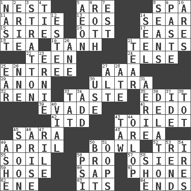 ACROSS 1. A home for chicks 5. "We ___ not amused" (Victoria) 8. Health resort 11. Nick name for Arthur 13. Greek goddess of the dawn 14. Dry up 15. Titles for men of rank and authority 16. Baseball player Mel 17. Relaxation 18. Beverage made from leaves 19. Hyperbolic tangent 21. Portable shelters 22. Adolescent 24. Otherwise 25. Main course 27. Auto club (abbr.) 29. Soon (poet.) 30. Extreme 32. Painter Guido (1575-1642) 33. Clothes sense 35. Prepare for publication 39. Elude 41. Make new 42. It would 43. Bathroom plumbing fixture 45. "Two Mules for Sister ____" 48. Length times width 49. Showery time 50. Soup holder 52. Three (prefix) 55. Earth 56. Adept person 57. Flexible twig of a willow tree 59. Flexible conduit 60. Plant excrement 61. Give a jingle 62. Compass dir. 63. It is 64. Conclusions DOWN 1. Political cartoonist Thomas 2. One of the Great Lakes 3. Ski resort town in Vermont 4. Make a knot 5. Period of immesurable duration 6. Writer of Portnoy's Complaint (1969) 7. Eastern Standard Time (abbr.) 8. Actors Connery and Penn 9. Thick mixture 10. Ancient Greek god of war 12. First name in cosmetics 14. Stitch closed the eyes of (a falcon) 20. One (Scot) 21. Lacerate 23. Bert's buddy 25. Ewer handle 26. Compass dir. 27. The first octave above the treble staff 28. Had dinner 30. Purpose 31. Nest on high 33. Make lace 34. Find the sum of 36. Conveyance 37. Binary compound 38. Small child 40. Small bottle 43. The 23rd letter of the Hebrew alphabet 44. Lowest deck of a ship 45. Soup utensil 46. Ascend 47. Cause heat under the collar 49. American tennis player Robert 50. Naughty child 51. I made a mistake 53. Tear apart 54. Angers 56. 23rd letter of the Greek alphabet 58. A female animal or person