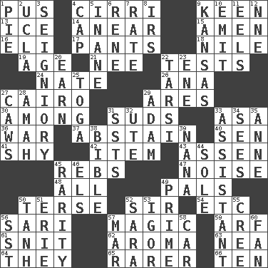 ACROSS 1. Fluid product of inflammation 4. High-altitude cloud 9. Peachy ____! 13. Frozen water 14. Approach 15. So be it 16. Biblical high priest 17. Leg coverings 18. "Death on the ____" 19. Personal question 21. Born 22. Trials 24. Nathan's nickname 26. Santa ___, CA 27. Capital of Egypt 29. Ancient Greek god of war 30. Amid 31. Beer foam 33. White ___ sheet 36. Armed conflict 37. Refrain by choice 40. Elected rep. 41. Like a shrinking violet 42. A distinct part 43. NE Netherlands city 45. Confederate soldiers (slang) 47. Annoying sound 48. Everything 49. Friends 50. Laconic 52. Title for a knight 54. And so on (abbr.) 56. Indian skirt 57. Mysterious quality of enchantment 59. Sandy's bark 61. In a ____ (agitated or irritated) 62. Odor 63. Teachers' org. 64. Those people 65. Less widely known 66. Nine, plus one DOWN 1. Sliced dessert 2. Southern CA. univ. 3. Signiory (variant) 4. Head covering 5. Lacking in sense or substance 6. French philosopher Descartes 7. Pace 8. Big collection agency 9. Sunflower state 10. Give off 11. Snakelike fish 12. Compass dir. 20. Merit 22. Tarsus (plural) 23. Compass dir. 25. Ancient Roman robe 27. Crow sounds 28. Nursemaid 29. First man 31. Fast planes 32. Shoshoni 33. Aide 34. Observes 35. Singer Murray 38. The Good Book 39. Grandmother 44. Not divided or shared with others 45. Noteworthy scarcity 46. Raised railways 49. First class 50. Hyperbolic tangent 51. One of the Great Lakes 52. "Two Mules for Sister ____" 53. Composer Stravinsky 55. Algonquian 56. Fast jet (abbr.) 57. Third mo. 58. Auto 60. Air blower