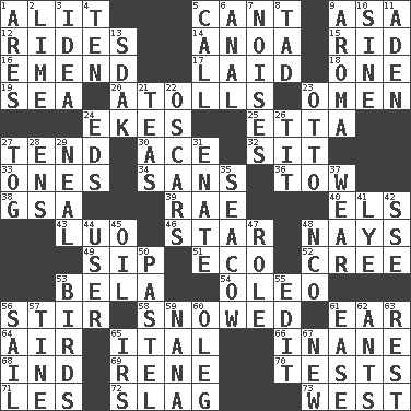 ACROSS 1. Came down and settled, as after flight 5. Patter 9. White ___ sheet 12. Amusement-park features 14. Small Philippine buffalo 15. To free from 16. Make improvements or corrections to 17. Put down 18. Single 19. Ocean 20. Ringlike coral islands and reefs 23. Sign of things to come 24. Supplements with great effort 25. Singer James 27. Look after 30. Adept person 32. Be seated 33. Washington bills 34. Without 36. Pull behind 38. Girls' org. (abbr.) 39. Actress Charlotte 40. Raised railways 43. Nilotic language 46. Play the lead 48. Negative votes 49. Small drink 51. Environmental prefix 52. Algonquian 53. Actor Lugosi 54. Margarine 56. Commotion 58. Frozen precipiation fell 61. Hearing organ 64. Wind 65. Slanted text style (abbr.) 66. Silly 68. Working for oneself (abbr.) 69. French philosopher Descartes 70. Trials 71. French article 72. Volcanic refuse 73. 270 degrees DOWN 1. Ancient Greek god of war 2. Citrus frut 3. The main thing one is thinking about 4. "___ Little Indians" 5. Give a ring to 6. Of or related to the anus 7. Annoying sounds 8. Small boy 9. Scent 10. Trig term 11. Arabian gulf 13. Neighbor of Neb. 21. Afternoon social gatherings 22. Motion picture awards 23. "Beetle Bailey" pooch 24. Begley and Asner 26. Teat (slang) 27. Coat; cloak 28. Followers of ems 29. Be tempered by heat 31. Maternal 35. Manatee 37. Put on (as clothing) 41. Potassium hydroxide 42. Compass dir. 44. One who uses or employs something 45. Lubricate 47. Hero or heavy, e.g. 48. Non-commissioned officer (abbr.) 50. Soft color 53. Avian creatures 55. Prepare for publication 56. Travel by water 57. Prong on a fork 59. Nanny 60. Cassini of fashion 61. Comfort 62. Pismires 63. Respite 65. Big collection agency 67. ___ Haven, CT