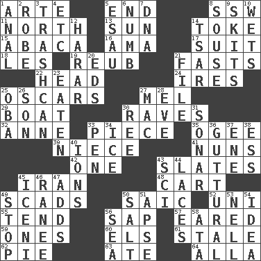 ACROSS 1. Johnson of "Laugh-In" 5. Conclude 8. Compass dir. 11. _ pole 13. Player for Phoenix 14. Casino tip 15. Phillipine bananalike plant 16. Nursemaid (var.) 17. Set or collection 18. French article 19. Reuben's nickname 21. Goes without food and/or water 22. Froth on beer 24. Angers 25. Motion picture awards 27. Cartoonist voice _ Blanc 29. Water vessel 30. All-night dance parties 32. Singer Murray 33. Component 35. Double curve, resembling the letter S 39. Sibling's daughter 41. Religious women 42. Single 43. Chalkboards 45. SW Asia republic 48. Haul 49. Tons 50. Ketch in the Levant 52. University (slang) 55. Look after 56. Plant excrement 57. Having ears or earlike features 59. Washington bills 60. Raised railways 61. Having lost freshness 62. Sliced dessert 63. Had dinner 64. Silent film actress Nazimova DOWN 1. Of or related to the anus 2. Loose flowing garment 3. File 13 4. And so on (abbr.) 5. Son of Isaac 6. Unfeeling 7. Heredity factor (abbr.) 8. Lush 9. Burlesque acts 10. Moistens 12. Ethiopian city, capital of Harari 14. Russian ruler of old 20. Begley and Asner 21. Do some clerical work 23. Eroded 25. Chief or king in Benin or Nigeria 26. Male offspring 27. Big _ 28. First lady 30. Portuguese money of account (variant) 31. Echolocation 33. Animal enclosure 34. Frozen water 36. From the throat 37. Compass dir. 38. Double-curved letter 40. Charged atoms 43. _-fi 44. Shoestrings 45. Ancient Celtic tribe of eastern Britain 46. Indian princess (variant) 47. Does sums 49. Discontinue 50. Table seasoning 51. Domed church section 53. 1994 drama film starring Jodie Foster 54. The main thing one is thinking about 56. Ocean 58. "One Day ___ Time"