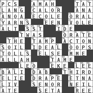ACROSS 1. Personal Computers (abbr.) 4. Housemaid 8. Make lace 11. Long (Scottish) 13. Bodily heat indicating an inflammation 15. Santa ___, CA 16. Small Philippine buffalo 17. Learning spot: Fr. 18. Relating to the mouth 19. Tall tales 21. Car or cant ending 22. Grand slam 23. Keyboard modifier key 24. Fast jet (abbr.) 27. Binary compound 29. It was, poetically 30. Declaim 34. Definite Article 36. Pack (down) 39. 13-14th century defensive garment 40. Land 41. Perfect 43. I made a mistake 44. For Whom the Bell _____ 46. Otherwise 47. Madame (abbr.) 48. Assad's deity 49. Docile 51. Lion 53. Supplement with great effort 54. Area sheltered from the wind 57. Indonesian resort city 60. Pat or tap gently 63. One of three equal parts 65. Writer Wiesel 66. Window treatment 69. Inactive volcano in Sicily 70. 54 in ancient Rome 71. Sir (Sp.) 72. Famous astronaut Armstrong 73. Had dinner 74. Bristle 75. To separate or throw off DOWN 1. Beach, in Buenos Aires 2. Lessep's creation 3. Derisive sound 4. Adept person 5. Big _ 6. Medicinal plant 7. Hollow 8. Pacific island yam 9. Of or related to the anus 10. Falsehood 12. Separate the seeds from cotton 14. Painter Guido (1575-1642) 18. Conquer 20. Compass dir. 25. Suttee (variant) 26. Sadhe (variant) 28. ___ good deed 29. Copy Pinocchio 31. Tiny particle 32. Drink excessively 33. Followers of ems 34. Utensil 35. Land elevation 37. Cartoonist voice _ Blanc 38. Thick mixture 40. R.R. building 42. Path through which fluid escapes 45. A female animal or person 50. Was introduced to 52. Probability 54. 61 cubic inches 55. Bert's buddy 56. Peak District village in England 57. Actor Lugosi 58. Came down and settled, as after flight 59. Not recorded 61. Ancient Greek god of war 62. Object of repulsion 64. Layer 67. Cooking vessel 68. Period