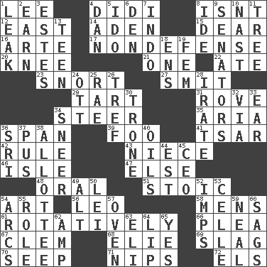 ACROSS 1. Area sheltered from the wind 4. "You Light Up My Life" star Conn 8. Is not 12. Compass direction 14. An important port of Yemen 15. Letter starter 16. Johnson of "Laugh-In" 17. Unrelated to defense, as in spending 20. Leg joint 21. Single 22. Had dinner 23. Derisive sound 27. Stricken, poetically 29. Small pie 31. Be footloose 34. Bull 35. Operatic vocal solo 36. Connect, as a bridge 39. Egg _ yung 41. Russian ruler of old 42. General guideline 43. Sibling's daughter 46. Small island 47. Otherwise 48. Spoken 51. Unemotional 54. Nonscientific branch of learning 56. Lion 58. Not women's 61. Producing rotation 66. Entreaty 67. Clement's nick name 68. Writer Wiesel 69. Volcanic refuse 70. Ooze 71. Pinches, bites 72. Raised railways DOWN 1. Path through which fluid escapes 2. Merit 3. _____ Park, CO 4. One of the 12 tribes of Israel 5. Wedding promise 6. Lair 7. _ china 8. Binary compound 9. Legislators 10. Political cartoonist Thomas 11. Woody plant 13. Adolescent 18. Followers of ems 19. Opposite of masc. 24. Baseball player Mel 25. Actress Charlotte 26. Unclean, religiously 28. Feeling or showing extreme anger 30. Marketplace scale 32. By way of 33. Ewer handle 34. Scornful expression 36. Indian title of respect (Mr.) 37. Product of festering 38. One to whom something is allotted 40. Petroleums 44. Eastern Standard Time (abbr.) 45. Corporate head (abbr.) 49. The first octave above the treble staff 50. Luau accessory 52. Naughty children 53. Cell (Danish) 54. Arches 55. Hero or heavy, e.g. 57. Baking chamber 59. Actress Patricia 60. Droops 62. Electrical Unit 63. Biblical high priest 64. Mouth edge 65. Affirmative reply