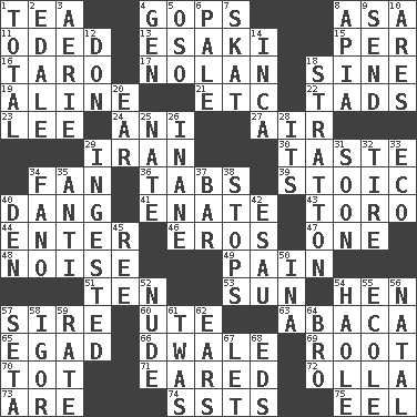 ACROSS 1. Beverage made from leaves 4. Republicans 8. White ___ sheet 11. Wrote a lyric poem 13. 1973 Nobel Price Winner (Physics) Leo 15. For each 16. Edible starchy tuberous root 17. Pitcher Ryan 18. Trig term 19. Place in a line 21. And so on (abbr.) 22. Small amounts or degrees 23. Area sheltered from the wind 24. Black tropical American cuckoo 27. Atmosphere 29. SW Asia republic 30. Clothes sense 34. Avid follower 36. Bar bills 39. Unemotional 40. Mild oath, euphamism for damn 41. Maternal 43. "Corrida" creature 44. Keyboard key 46. Greek god of love 47. Single 48. Annoying sound 49. Ache 51. Nine, plus one 53. Player for Phoenix 54. Layer 57. Title for a man of rank and authority 60. Shoshoni 63. Phillipine bananalike plant 65. Mild oath 66. A sleeping potion; an opiate (poet.) 69. Carrot, for example 70. Small child 71. Having ears or earlike features 72. Water jar 73. "We ___ not amused" (Victoria) 74. Fast planes 75. Snakelike fish DOWN 1. Add up to 2. Peak District village in England 3. Nest on high 4. Commissioned military rank (abbr.) 5. Bear (Spanish) 6. Diluted with white 7. Three-handed card game 8. Capital of Western Samoa 9. Transmit 10. Ancient Greek god of war 12. Spanish title 14. South American Indian 18. Ski resort town in Vermont 20. Ewer handle 25. Nathan's nickname 26. Silly 28. It is 29. Swallowed 31. Within a short period 32. Hoop that covers a wheel 33. Environmental prefix 34. Papal veil 35. Opposed to 37. Soap unit 38. Closes up, plugs up 40. Lair 42. He sold his birthright 45. To riddle 50. _ tizzy (2 wds.) 52. Naked 54. White Person, in Hawaii 55. Learning spot: Fr. 56. Brizilian seaport 57. Stalk of a moss capsule 58. Russian composer Stravinsky 59. Assign a rank or rating to 61. It was, poetically 62. Hearing organs 64. Sis' sibling 67. Allow 68. Begley and Asner