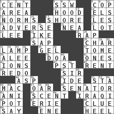 ACROSS 1. Penny 5. Compass dir. 8. Police officer (slang) 11. Length times width 12. Parka part 14. Raised railways 15. Typical models 17. Dinah or Pauly 18. French article 19. Contrary to your interests or welfare 21. Teachers' org. 22. Car dealer's back yard 23. Area sheltered from the wind 24. Mamie's mate 25. Hit sharply and swiftly 27. Plant excrement 28. Burn to charcoal 31. Desk light 35. Set 37. Heavy book 38. Toward shelter 39. ___ good deed 41. Singles 42. Charged atoms 43. Pacific Standard Time (abbr.) 45. Monthly bill 46. Redecorate 47. Title for a knight 49. Viper 51. Binary compound 52. R.R. building 55. Apple computer (short form) 57. Rowing implement 60. Legislator 62. Cuckoo 63. Odor 65. Resident of Iraq 66. Plant holder 67. 4th largest of the Great Lakes 68. A slight indication 69. Declare 70. Compass dir. 71. Person who is morally reprehensible DOWN 1. Lessep's creation 2. Eat (away) 3. Boldness 4. Not wild 5. Quiet! 6. Within a short period 7. Had on 8. Portable communications device 9. Butter sub 10. Inconspicuous attention getter 13. Letter starter 16. Indian titles of respect 17. Oozed 20. Heroin 26. Thespian 29. So be it 30. State of inaction 31. Den 32. _ vera 33. Ananias' fault 34. Mexican monetary units 36. Trim (branches) 40. Aid 44. Event that recurs at intervals 48. Painter Guido (1575-1642) 50. Airs 52. Lacking originality or spontaneity 53. Woman's close-fitting hat 54. Satellite of Uranus 55. Atlas contents 56. Small Philippine buffalo 58. Measure of real estate 59. It's straight from the horse's mouth 61. Bowlike part 64. Born