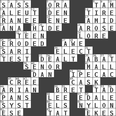 ACROSS 1. Backtalk 5. Mouth or opening 8. Scottish cap 11. Native American of Southwest Alaska 13. Lair 14. Hoop that covers a wheel 15. Indian princess (variant) 16. Compass dir. 17. Among 18. Santa ___, CA 19. Flintstone garb 21. Came up 22. Adolescent 24. Old wives' tales, e.g. 25. Worn away 27. Deep reverence 29. Indian skirt 30. Choose 32. Trial 33. Started a card game 35. Blind as ____ 39. Sir (Sp.) 41. Shopping center 42. Daniel's nick name 43. Medicinal drug used to evoke vomiting 45. Algonquian 48. Keg 49. Believer in; advocate of (suffix) 50. Cy Young winner Saberhagen 52. Small boy 55. Baking dishes 56. Area sheltered from the wind 57. Peak District village in England 59. System (abbr.) 60. Raised railways 61. Thermoplastic polyamide 62. Compass dir. 63. Make lace 64. Makes supply last DOWN 1. "Two Mules for Sister ____" 2. Actor Alda or Thicke 3. Legislators 4. Institute legal proceedings 5. Wrote a lyric poem 6. French philosopher Descartes 7. A saturated hydrocarbon 8. The easternmost of the Lesser Sundas 9. Ascend 10. Ancient Persian 12. Giggle 14. Pacific island yam 20. Working for oneself (abbr.) 21. Actor Baldwin 23. Proofreads 25. Eastern Standard Time (abbr.) 26. Actress Charlotte 27. Everything 28. Soggy 30. Hearing organ 31. Domesticates 33. Heredity factor (abbr.) 34. Period of immesurable duration 36. Sass 37. In the manner of 38. Affectionate concern, for short 40. Locale of original sin 43. Frozen water 44. Eucharist need 45. Trading vessels 46. Remove soap 47. 90 degrees 49. Domed church section 50. Actor Lugosi 51. Respite 53. Medicinal plant 54. Habitations of wild animals 56. Allow 58. Color