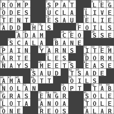 ACROSS 1. Play 5. Argument over a trivial matter 9. Part of a journey 12. Lyric poems 13. Southern CA. univ. 14. Not recorded 15. Portable shelter 16. Son of Isaac 17. Writer Wiesel 18. Say or write further 19. Part of HMS, perhaps 21. Fencing necessities 22. First man 24. Corporate head (abbr.) 26. Compass dir. 27. Any of the three canals of the cochlea 28. Object of repulsion 29. Ache 30. Entertaining tales 32. A whole individual unit 36. Johnson of "Laugh-In" 37. French article 38. Dormintory (informal) 39. Negative votes 40. Confronts 42. Relaxation 43. Saudi Arabian king (1953-1964) 44. Sadhe (variant) 46. Nursemaid (var.) 49. Baseball player Mel 50. Petroleums 51. Pitcher Ryan 53. Choose 54. Bar bill 57. Pate de foie ____ 58. Engineer (abbr.) 61. Flatfish 62. Globular water bottle used in Asia 63. Small Philippine buffalo 64. Lacquered or enameled metalware 65. Single 66. Vintage cars 67. Having or resembling wings DOWN 1. Roll call or roster of names 2. Wrote a lyric poem 3. Ananias' fault 4. Pacific Standard Time (abbr.) 5. Takes to court 6. Personal Computers (abbr.) 7. According to 8. The 19th letter of the Greek alphabet 9. Ms. Damita and namesakes 10. Vices 11. Honkers 14. Lion 19. Actor Linden 20. "If ____ say so..." 21. Enemy 23. Natives or inhabitants of Denmark 24. 2nd pers. sing. pres. of can (arch.) 25. Followers of ems 27. "Two Mules for Sister ____" 28. A special lineage 29. Baking dish 31. Native American of Southwest Alaska 32. Perfect 33. Inedible or poisonous agaric 34. Celtic language 35. Madame (abbr.) 40. Floor covering 41. Constrict 43. Manchild 45. Be seated 46. White American of non-Hispanic descent 47. Person of subnormal intelligence 48. Having winglike extensions 52. White ___ sheet 53. Mouths or openings 55. Silent film actress Nazimova 56. Fermented drink made from hops 58. Ewer handle 59. Compass dir. 60. Thick or sticky substance 61. R.R. building