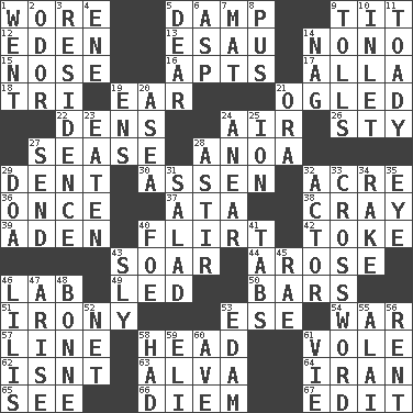 ACROSS 1. Had on 5. Moist 9. Teat (slang) 12. Paradise 13. He sold his birthright 14. Words to Nanette 15. Sense of smell 16. Tenement units (abbr.) 17. Silent film actress Nazimova 18. Three (prefix) 19. Ewer handle 21. Stared at amorously 22. Hiding places for outlaws 24. Atmosphere 26. Filthy place 27. Gospel singer Marvin 28. Small Philippine buffalo 29. Gouge 30. NE Netherlands city 32. Measure of real estate 36. Single time 37. "One Day ___ Time" 38. Supercomputer manufacturer 39. Arabian gulf 40. Talk or behave amorously 42. Puff or smoke 43. Fly high 44. Came up 46. Experiment locale 49. Directed 50. Long, evenly shaped pieces 51. Literary sarcasm 53. Compass dir. 54. Armed conflict 57. Actor's bit 58. Froth on beer 61. Short-tailed, large-bodied rat 62. Is not 63. Inventor's middle name 64. SW Asia republic 65. Perceive with the eye 66. South Vietnam president (1954) 67. Prepare for publication DOWN 1. Left 2. Aroma 3. Dwelling 4. Compass dir. 5. Letter starter 6. Viper 7. Floor covering 8. Fluid product of inflammation 9. For Whom the Bell _____ 10. An arm off of a larger body of water 11. Sycophant 14. Tired old horse 19. Followers of ems 20. Toward the sea 21. Mouth or opening 23. Consumed 24. Approach 25. Electrically charged atom 27. Transmit 28. Being in motion 29. ___ good deed 31. Vegetable dish 32. Thespian 33. What you're doing now 34. Immoral or dissolute person 35. Sight organ 40. Enemy 41. Bar bills 43. Wily 45. Actress Charlotte 46. Ms. Damita and namesakes 47. Get up 48. Child's nurse 52. Fish or hair follower 53. Dutch treat 55. Mountain range southwest of Kyrgyzstan 56. Monthly bill 58. Possessed 59. Biblical high priest 60. "___ Maria" 61. Compete