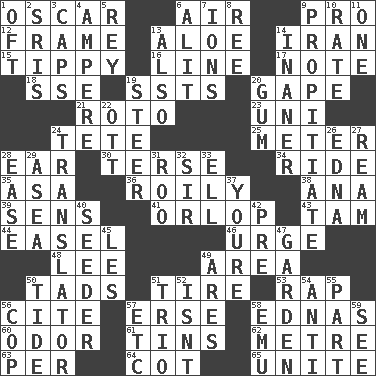 ACROSS 1. Witty Wilde 6. Wind 9. Adept person 12. Movie unit 13. _ vera 14. SW Asia republic 15. Likely to tip or tilt 16. Actor's bit 17. Brief written record 18. Compass dir. 19. Fast planes 20. Stare wonderingly 21. Printing process, for short 23. Corn or form start 24. False hair 25. Distance measurement 28. Hearing organ 30. Laconic 34. Travel on an animal 35. White ___ sheet 36. Agitated, as a liquid 38. Santa ___, CA 39. Elected reps. 41. Fourth or lowest deck 43. Scottish cap 44. Artist's stand 46. Goad 48. Area sheltered from the wind 49. Type of rug 50. Bits 51. Become fatigued 53. Reproach for some lapse or misdeed 56. Quote 57. Celtic language 58. Ferber et al. 60. Aroma 61. Metal containers 62. Distance measurement (Brit.) 63. For each 64. Small bed 65. Join together DOWN 1. Often (poetically) 2. Indian titles of respect 3. Balmoral and tarboosh 4. Electrical Unit 5. Marina Del _, California 6. Came down and settled, as after flight 7. Charged atoms 8. To sift 9. Appease 10. Assign a rank or rating to 11. Single 13. In addition 14. Sillier 19. Bull 20. Chewing product 22. Baseball player Mel 24. Interpreter 26. Pulitzer Prize-winning author Ferber 27. 480, 500 or 516 sheets of paper 28. Comfort 29. Toward the sea 31. Friend of Pooh 32. Title for a knight 33. Pipe bend 37. You are 40. Sowing specialist 42. Before (prefix) 45. French article 47. Place where plants grow 49. Ancient Greek god of war 50. Periodic rise and fall of the sea level 51. Musical group of three 52. Is not 54. Against 55. Component 56. Police officer (slang) 57. And so on (abbr.) 58. Australian flightless bird 59. Observe