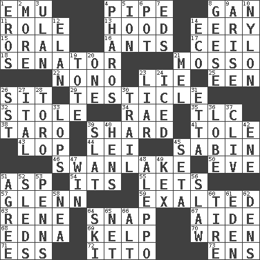 ACROSS 1. Australian flightless bird 4. Corncob 8. Separate the seeds from cotton 11. Hero or heavy, e.g. 13. Parka part 14. Suggestive of the supernatural 15. Of the mouth 16. Pismires 17. To provide with a ceiling 18. Legislator 21. With motion or animation 22. Words to Nanette 23. Whopper 25. Car or cant ending 26. Be seated 29. One of the two male reproductive glands 32. Fur scarf 34. Actress Charlotte 35. Affectionate concern, for short 38. Edible starchy tuberous root 39. Pottery fragment 41. Lacquered or enameled metalware 43. Chop off 44. Flowery wreath 45. Unit of acoustic absorption 46. Tchaikovsky ballet 50. First lady 51. Cleo's killer 54. ___ a Wonderful Life 55. Allows 57. American astronaut and politician John 59. Honored 63. French philosopher Descartes 64. Fastener 67. Helper 68. Pulitzer Prize-winning author Ferber 69. Seaweed 70. Songbird 71. Double-curved letter 72. "Tell ____ the Marines!" 73. Followers of ems DOWN 1. Greek god of love 2. Greater amount 3. ____ Bator, Mongolia 4. N Egypt peninsula 5. Electrically charged atom 6. Plant holder 7. Begley and Asner 8. Honkers 9. Originate 10. High-strength synthetic material 12. Liveliness 14. Environmental prefix 19. Lug 20. Single 21. Cartoonist voice _ Blanc 23. One who doesn't tell the truth 24. On the rocks 26. Fast jet (abbr.) 27. Slanted text style (abbr.) 28. "Corrida" creature 30. Get behind 31. Singer James 33. Chops off 36. Ear part 37. 154 in Roman numerals 39. Narrow board 40. Coop moms 42. Compass dir. 45. Stalk of a moss capsule 47. Victory 48. City in Syria 49. A weed 51. Match 52. Bobsleighs 53. Actor Sean's family 56. Cole _ (cabbage dish) 58. Teachers' org. 60. Hoop that covers a wheel 61. Genesis locale 62. Habitations of wild animals 64. What Jean-Claude Killy likes to do 65. Remaining after all deductions 66. Keyboard modifier key