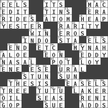 ACROSS 1. Snakelike fish 5. It is 8. Big _ 11. Prepare for publication 12. Canisters 14. Period 15. Amusement-park features 17. Tiny particle 18. Pile 19. Next before 21. Noteworthy scarcity 23. Victory 25. Greek god of love 26. Southeast Asian peninsula 27. R.R. building 28. Raised railways 31. Conclude 33. And so on (abbr.) 35. Non-adult bird? 37. _ vera 38. Period of immesurable duration 40. Whirlpool 41. Relating to the nose 43. Cooking vessel 45. Myrna of the movies 46. Compass dir. 47. Compass dir. 50. Mountain range 52. Make senseless or dizzy 53. Player for Phoenix 54. College paper 56. Artist's stands 61. Woody plant 62. Ballerina skirt 65. Member of a famous L.A. basketball team 66. Lubricate 67. Oceans 68. Painter Guido (1575-1642) 69. Grand Old Party 70. Take to court 71. Sums up DOWN 1. Suggestive of the supernatural 2. Singer Brickell 3. Hats (slang) 4. Proofreading order 5. Call ___ day 6. Teat (slang) 7. Sounds asleep 8. Confront 9. Like ___ of sunshine 10. Head covering 13. Don Adams' spy role 16. Stitched 18. Part of HMS, perhaps 20. Travel on or in a vehicle 22. Wander aimlessly 24. Make mention of 26. The content of cognition 28. Inside; within (prefix) 29. Kenny Rogers chart-topper in '80 30. Like a shrinking violet 31. Liveliness 32. Sense of smell 34. Police officer (slang) 36. Shout 37. One (Scot) 39. Horse sense 42. Allows 44. Loyal 48. Sets of matching outer garments 49. Follows as a consequence or result 51. Of or related to the anus 52. Perceive with the eye 54. Musical group of three 55. Aid 57. "Two Mules for Sister ____" 58. Made supply last 59. Grant temporary use of 60. Indian titles of respect 61. Coat; cloak 63. The 19th letter of the Greek alphabet 64. Purpose