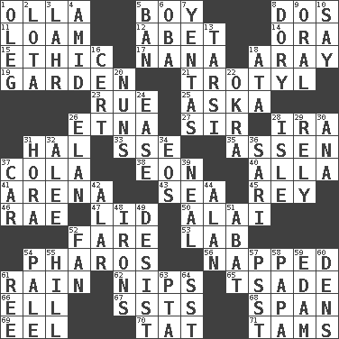 ACROSS 1. Water jar 5. Male child 8. Two (Sp.) 11. Rich soil 12. Collude with 14. Mouth or opening 15. Value system 17. Nanny 18. Like ___ of sunshine 19. Place where plants grow 21. Trinitrotoluene 23. Regret 25. "____ silly question..." 26. Inactive volcano in Sicily 27. Title for a knight 28. Retirement account (abbr.) 31. Actor Linden 33. Compass dir. 35. NE Netherlands city 37. Root beer relative 38. Period of immesurable duration 40. Silent film actress Nazimova 41. Sports stadium 43. Ocean 45. Marina Del _, California 46. Actress Charlotte 47. Flaplike covering 50. Mountain range southwest of Kyrgyzstan 52. Conductor's collection 53. Experiment locale 54. N Egypt peninsula 56. Slept 61. Water falling in drops from the sky 62. Pinches, bites 65. Sadhe (variant) 66. Pipe bend 67. Fast planes 68. Connect, as a bridge 69. Snakelike fish 70. Make lace 71. Scottish caps DOWN 1. Cassini of fashion 2. Globular water bottle used in Asia 3. Cowardly lion portrayer 4. Among 5. Prohibit 6. Chief or king in Benin or Nigeria 7. Gossips 8. Rowboat 9. Taken by mouth 10. Declare 13. Tarsus (plural) 16. Foregone conclusion 18. "One Day ___ Time" 20. Religious women 22. Gumbo ingredient 24. Comfort 26. Liveliness 28. Capri or Wight 29. Trust 30. Santa ___, CA 31. Israeli folk dance 32. Toward shelter 34. Greek goddess of the dawn 36. Indian skirt 37. Auto 39. Be tempered by heat 42. Having or resembling wings 44. Actor Alda or Thicke 48. Removes the wrinkles 49. Stop 51. Blind as ____ 52. Avid follower 54. Light colored 55. Land elevation 57. Inconspicuous attention getter 58. Dad 59. Dutch treat 60. Cub Scout units 61. To sift 63. Parent Teacher Association (abbr.) 64. Fast jet (abbr.)