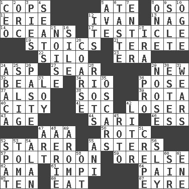 ACROSS 1. 911 reaches them 5. Had dinner 8. Bear (Spanish) 11. 4th largest of the Great Lakes 12. _ the terrible 13. Tired old horse 14. Seas 17. A testis 19. Unemotional ones 21. Cylindrical with tapered ends 22. Grain storage tower 23. Period 24. Cleo's killer 27. Singe 29. ___ Haven, CT 32. Memphis, Tenn. Street 34. _ de Janeiro 36. Introduce or present, as a question 37. In addition 38. Distress signal 39. Round or rotation of duties 40. Municipality 41. And so on (abbr.) 42. Failure 43. Personal question 44. Indian skirt 46. Curvy letter 47. Auto club (abbr.) 50. College mil. group 52. A viewer who gazes fixedly 55. Michaelmas daisies 57. Characterized by complete cowardliness 59. Threatening words 62. Housemaid (var.) 63. Body of Kaffir warriors 64. Ache 65. Nine, plus one 66. Ingest 67. Jane of fiction DOWN 1. Corporate head (abbr.) 2. The grampus (Milton) 3. Sliced desserts 4. Theater features 5. "___ Maria" 6. Clothes sense 7. Keyboard key 8. At one time in the past 9. Table seasoning 10. Double curve, resembling the letter S 12. It is 15. Annoying sound 16. Drop; flow; fall 18. Retirement account (abbr.) 20. Unrefined 24. Phillipine bananalike plant 25. Former Milwaukee Brewers owner Bud 26. Thick mixture 28. Debaucheries 29. Trap for birds or small mammals 30. _____ Park, CO 31. Erodes 33. Myrna of the movies 35. Motion picture awards 36. Adept person 42. 61 cubic inches 45. Printing process, for short 47. Tate display 48. Nest on high 49. Odor 51. Streamer paper 52. Petty quarrel 53. Heavy book 54. Actor Alda or Thicke 55. Cuckoo 56. Kill 58. Elect 60. Title for a knight 61. Compass dir.