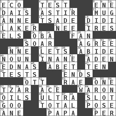 ACROSS 1. Environmental prefix 4. Trial 8. Compass dir. 11. Raised platform 13. Moving about 15. Java container 16. Queen of England 1702-14 17. Sadhe (variant) 18. "You Light Up My Life" star Conn 19. Member of a famous L.A. basketball team 21. Born 22. Angers 23. Raised railways 24. Chief or king in Benin or Nigeria 27. Air blower 29. Fly high 30. Match 34. Compass dir. 36. Allows 39. Remain 40. Part of speech 41. Empty; void 43. Arabian gulf 44. Ferber et al. 46. Collude with 47. Nine, plus one 48. Trials 49. Extremities 51. Baseball player Mel 53. Actress Charlotte 54. Single 57. Russian ruler 60. Adept person 63. Make _____ (do battle with) 65. Petroleums 66. Extremist 69. Position in a hierarchy or organization 70. Thick or sticky substance 71. "_____ Recall" 72. Introduce or present, as a question 73. One (Scot) 74. Dad 75. For each DOWN 1. Peak District village in England 2. Lessep's creation 3. Pig sounds 4. Make lace 5. Curvy letter 6. Comedian Laurel of Laurel & Hardy 7. Event that recurs at intervals 8. Arab leader 9. Unadorned 10. The front part of a cuirass 12. Perceive with the eye 14. Coral collection 18. Empty-headed or silly people 20. Friend of Pooh 25. Indonesian resort city 26. Sports stadium 28. Auto club (abbr.) 29. Elected representatives 31. Travel on or in a vehicle 32. Genesis locale 33. Car or cant ending 34. Thickened enlargement 35. Religious women 37. Bar bill 38. Scornful expression 40. Remaining after all deductions 42. Inactive volcano in Sicily 45. Fast jet (abbr.) 50. Morning condensation 52. Tense 54. Fourth or lowest deck 55. Trap for birds or small mammals 56. Keyboard key 57. Ancient Roman robe 58. The Jewish people; Israel 59. Medicinal plant 61. Hoof sound 62. Singer James 64. Viper 67. Strike 68. Chicken ___ king
