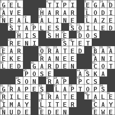 ACROSS 1. Set 4. Native american tent (variation) 8. Mild oath 12. "___ Maria" 13. Ethiopian city, capital of Harari 14. Farming town in central California 15. Anneal 17. Place in a line 18. Goldbrick 19. Paper fasteners 21. Dirtied 23. Part of HMS, perhaps 24. A female animal or person 26. Two (Sp.) 27. Painter Guido (1575-1642) 28. Proofreading order 30. Ewer handle 31. Spoke pompously 34. Sound made by sheep 37. Make supply last 38. Indian princess (variant) 39. Cuckoo 40. Directed 41. Place where plants grow 42. Small bed 43. Introduce or present, as a question 44. "____ silly question..." 46. Male offspring 47. Reproach for some lapse or misdeed 50. Personal Computers (abbr.) 51. Wine fruits 54. Portable computers 57. Cause heat under the collar 58. Feeling or showing extreme anger 60. Story 62. "If ____ say so..." 63. 61 cubic inches 64. Island 65. Unadorned 66. Locale of original sin 67. She-sheep DOWN 1. Separate the seeds from cotton 2. Nights before holidays 3. Resembling or made to resemble leather 4. Lies 5. From or relating to Ireland 6. Baking dish 7. Angers 8. American author Paul (1891-1958) 9. Finish lines 10. Axlike tool, used for shaping wood 11. Passed on 13. Actor Linden 16. (Had) reclined 20. Air pressure measure (abbr.) 22. Wrote a lyric poem 25. First name in cosmetics 27. Immoral or dissolute person 29. Adolescent 30. Snakelike fish 31. Mouths or openings 32. More uncommon 33. Plus 34. Keyboard key 35. Small Philippine buffalo 36. Small island 41. Went 43. Wimpy's pal 44. Fitting 45. Native of Scotland 46. First course 48. Having winglike extensions 49. Eucharist need 51. Amused look 52. Tall New Zealand timber tree 53. Drop; flow; fall 55. For each 56. Cole _ (cabbage dish) 59. To free from 61. Sight organ