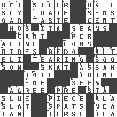 ACROSS 1. Sep. follower 4. Guide 9. Migrant worker of the '30s 13. Roguish 14. Feeling or showing extreme anger 15. Elected reps. 16. Rowing implement 17. Clothes sense 18. Penny 19. Crowd into 21. Call ___ day 22. Actors Connery and Penn 24. Patter 26. For each 27. Place in a line 29. Immeasurably long periods of time 30. Amusement-park features 31. Make new 33. Keyboard modifier key 36. Connecticut Ivy Leaguer 37. Separating forcefully 40. "Barney Miller" actor Jack 41. Boy, to dad 42. Three-handed card game 43. Indian state 45. Haul 47. One or ones belonging to thee 48. Compass dir. 49. Observes 50. Match 52. Before (prefix) 54. R.R. building 56. Turn sharply 57. Component 59. Wing 61. Narrow board 62. Arguments over trivial matters 63. Teachers' org. 64. Docile 65. Laconic 66. Beverage made from leaves DOWN 1. Bear (Spanish) 2. Burrowing marine mollusk 3. Polypeptide antibiotic 4. Be seated 5. Distinguishing feature 6. 90 degrees 7. Singer James 8. To sift 9. Motion picture awards 10. Peachy ____! 11. Restaurants 12. Eastern Standard Time (abbr.) 20. Object of repulsion 22. Soup utensil 23. Car or cant ending 25. Egg locale 27. Ancient Greek god of war 28. _ and Stitch 29. Prepare for publication 31. Libertine 32. Epoch 33. Helper 34. Grant temporary use of 35. Heavy book 38. First name in cosmetics 39. Yard entry 44. "______ My Girl" (Turtles hit) 45. Cylindrical with tapered ends 46. Single 49. Religious groups 50. Silent film actress Nazimova 51. Island territory of the United States 52. Corncob 53. Located in or toward the back 55. Toward shelter 56. Fast jet (abbr.) 57. Pacific Standard Time (abbr.) 58. Compass dir. 60. American Automobile Association (abbr.)