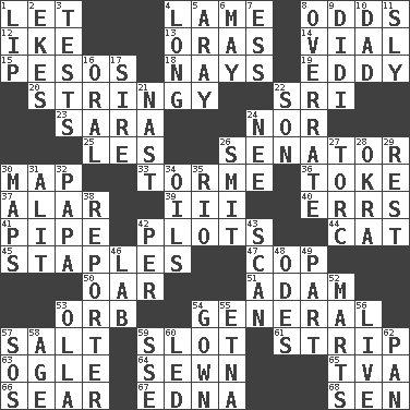 ACROSS 1. Allow 4. Unable to walk 8. Likelihood 12. Mamie's mate 13. Mouths or openings 14. Small bottle 15. Mexican monetary units 18. Negative votes 19. Whirlpool 20. Slender, wiry 22. _ Lanka 23. "Two Mules for Sister ____" 24. And not 25. French article 26. Elected representative 30. Atlas unit 33. Singer Mel 36. Casino tip 37. Having or resembling wings 39. One more than two 40. Blunders 41. Corncob 42. Secret plans 44. Domesticated feline 45. Paper fasteners 47. Police officer (slang) 50. Rowing implement 51. First man 53. Globe 54. Commissioned military rank 57. Table seasoning 59. Narrow, elongated depression 61. Empty completely 63. Stare 64. Stitched 65. Federal power corp. 66. Dry up 67. Pulitzer Prize-winning author Ferber 68. Elected rep. DOWN 1. Mouth edge 2. Makes supply last 3. Trials 4. Protracted 5. Like ___ of sunshine 6. Fifth month 7. Double-curved letter 8. Make much ado about nothing 9. "You Light Up My Life" star Conn 10. Male parent 11. Wily 16. Taken by mouth 17. Male parent of an animal 21. Political cartoonist Thomas 22. Male child 24. Born 26. Stricken, poetically 27. Torque (variant) 28. Gumbo ingredient 29. Relief 30. Atlas contents 31. Came down and settled, as after flight 32. Dad 34. Petroleums 35. River (Sp.) 38. News announcer 42. For each 43. Examine hastily 46. Experiment locale 48. Lyric poems 49. Role in a play 52. Shops 53. Rounded earthenware pot or jar 54. Woman's formal wear 55. Inactive volcano in Sicily 56. Moving, as bait 57. Mayday 58. Mature 59. Compass dir. 60. Directed 62. Baking dish