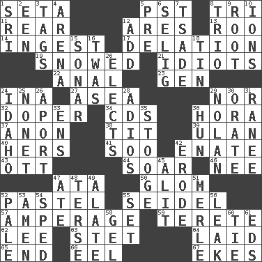 ACROSS 1. Stalk of a moss capsule 5. Pacific Standard Time (abbr.) 8. Three (prefix) 11. Hitchcock's "____ Window" 12. Ancient Greek god of war 13. Friend of Pooh 14. Eat 17. Conveyance 19. Frozen precipiation fell 21. Foolish or stupid persons 22. Of or related to the anus 23. Commissioned mil. rank 24. _ tizzy (2 wds.) 27. Toward the sea 29. And not 32. Drug addict 34. Music discs 36. Israeli folk dance 37. Soon (poet.) 38. Teat (slang) 39. ____ Bator 40. Possessive pronoun 41. "Barney Miller" actor Jack 42. Related on the mother's side 43. Baseball player Mel 44. Fly high 46. Born 47. "One Day ___ Time" 50. Take by theft 52. Soft color 55. A glass for beer 57. Electrical Measurement 59. Cigar-shaped 62. Area sheltered from the wind 63. Proofreading order 64. Put down 65. Conclude 66. Snakelike fish 67. Makes supply last DOWN 1. _ Lanka 2. Car or cant ending 3. Labels 4. Sports stadium 5. Before (prefix) 6. Major League Baseball Commissioner Bud 7. Sadhe (variant) 8. Musical group of three 9. Carrot, for example 10. Charged atoms 12. Find the sum of 15. Echolocation 16. It was, poetically 18. Shallow baking pan 20. Opts 24. Potato state 25. Music written for nine 26. To the left, to Queeg 28. Goodbye (Sp.) 29. Pitcher Ryan 30. Declaim 31. Indian princess (variant) 33. Followers of ems 35. Moe Howard, for one 36. Attila the _ 42. Wear away 45. Set down 47. Had dinner 48. Laconic 49. Having winglike extensions 51. Haggard of country music 52. Light colored 53. So be it 54. Broke a traffic law 55. Put into a specified state 56. Path through which fluid escapes 58. Set 60. Neckwear 61. Begley and Asner