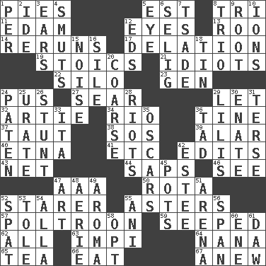 ACROSS 1. Sliced desserts 5. Eastern Standard Time (abbr.) 8. Three (prefix) 11. Dutch treat 12. Sight organs 13. Friend of Pooh 14. Summer TV shows 17. Conveyance 19. Unemotional ones 21. Foolish or stupid persons 22. Grain storage tower 23. Commissioned mil. rank 24. Product of festering 27. Scorch 29. Allow 32. Nick name for Arthur 34. River (Sp.) 36. Prong on a fork 37. Strained 38. Mayday 39. Having or resembling wings 40. Inactive volcano in Sicily 41. And so on (abbr.) 42. Prepares for publication 43. Fish or hair follower 44. Plant excrements 46. Observe 47. Auto club (abbr.) 50. Round or rotation of duties 52. A viewer who gazes fixedly 55. Michaelmas daisies 57. Coward 59. Oozed 62. 100% 63. Body of Kaffir warriors 64. Grandmother 65. Beverage made from leaves 66. Erode 67. Afresh DOWN 1. For each 2. Binary compound 3. Hearing organs 4. Particles of soot 5. Sight organ 6. Major League Baseball Commissioner Bud 7. Sadhe (variant) 8. Musical group of three 9. Carrot, for example 10. Charged particles 12. Begley and Asner 15. Annoying sound 16. Drop; flow; fall 18. Shallow baking pan 20. Rough 24. Eucharist need 25. A salt of uric acid 26. Difficult or unusual or dangerous feat 28. Disturbances 29. Ms. Damita and namesakes 30. Related on the mother's side 31. Laconic 33. Call ___ day 35. Motion picture awards 36. Bit 42. First name in cosmetics 45. Cooking vessels 47. Nonscientific branch of learning 48. Nest on high 49. Scent 51. Sports stadium 52. Argument over a trivial matter 53. Lacquered or enameled metalware 54. Silent film actress Nazimova 55. Cuckoo 56. Connect, as a bridge 58. Elect 60. Compass dir. 61. Obsolete