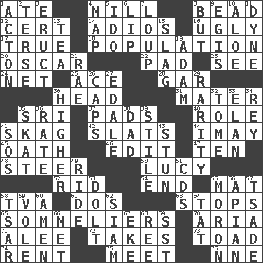 ACROSS 1. Had dinner 4. Place where flour is made 8. Necklace unit 12. Foregone conclusion 14. Goodbye (Sp.) 16. Unsightly 17. Loyal 18. Census information 20. Witty Wilde 22. Groovy apt. 23. Perceive with the eye 24. Remaining after all deductions 25. Adept person 28. Slender fish 30. Froth on beer 31. Mother 35. _ Lanka 37. Groovy apts. 40. Hero or heavy, e.g. 41. Heroin 42. Narrow boards 44. "If ____ say so..." 45. Pledge 46. Prepare for publication 47. "___ Little Indians" 48. Guide 50. "I Love _" 52. To free from 54. Conclude 55. Floor protector 58. Federal power corp. 61. Two (Sp.) 63. Ceases 65. Wine waiters 70. Roberta Peters solo 71. Toward shelter 72. Receives possession of 73. Frog relative 74. Monthly bill 75. Rendezvous 76. Compass dir. DOWN 1. NE Massachussets city 2. Laconic 3. Spew [out] 4. Atlas unit 5. Wedding promise 6. Mouth edge 7. Central Nebraska county 8. On the contrary 9. The front part of a cuirass 10. _ vera 11. Centimeter-gram-second unit of force 13. Beverage made from leaves 15. Volcanic refuse 19. First of billions? 21. Actress Charlotte 26. Smile enhancers 27. Peak District village in England 29. Noteworthy scarcity 30. Having greater elevation 32. Heavy book 33. Style 34. Marina Del _, California 35. Three-handed card game 36. Pace 38. June honoree 39. Vertical member of a panel or frame 41. Mayday 43. Surprise greatly 49. Travel on an animal 51. Music discs 53. Stupid person 55. Person of subnormal intelligence 56. Bee-related 57. Sadhe (variant) 58. Russian ruler of old 59. Grand slam 60. So be it 62. Thailand, formerly 64. Make lace 66. Was introduced to 67. Supplement with great effort 68. Portuguese money of account (variant) 69. Fast jet (abbr.)