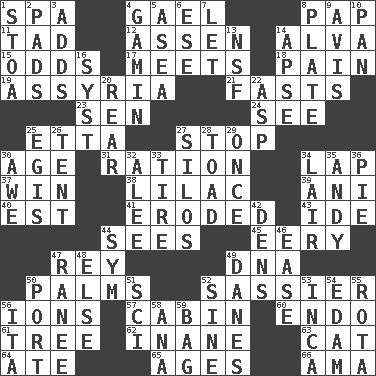 ACROSS 1. Health resort 4. Highlander 8. Infant food 11. Small boy 12. NE Netherlands city 14. Inventor's middle name 15. Probability 17. Confronts 18. Ache 19. Nineveh was its capital 21. Goes without food and/or water 23. Elected rep. 24. Observe 25. Singer James 27. Constrict 30. Ripen 31. Food allowance for one day 34. Infant locale 37. Acquire through effort 38. Pale purple color 39. Black tropical American cuckoo 40. Eastern Standard Time (abbr.) 41. Worn away 43. Binary compound 44. Perceives with the eye 45. Suggestive of the supernatural 47. Marina Del _, California 49. Heredity factor (abbr.) 50. Insides of hands 52. More disrespectful 56. Charged atoms 57. Small house or cottage 60. Inside; within (prefix) 61. Relationship diagram 62. Lacking in sense or substance 63. Feline 64. Had dinner 65. Eons 66. Nursemaid (var.) DOWN 1. Portico 2. Writing tablets 3. Sums up 4. Homeless child 5. At sea 6. Compass dir. 7. Allow 8. Food holder 9. Advice 10. Baking dish 13. Science/research agcy. 14. Domed church section 16. System (abbr.) 20. Stern 22. Cleo's killer 25. Armor plate that protects the chest 26. Portable shelter 27. Grain storage towers 28. Frog relative 29. Single time 30. Deep reverence 32. Toward shelter 33. Hoop that covers a wheel 34. Den 35. "60 Minutes" Commentator Rooney 36. Sliced dessert 42. Cub Scout units 44. Symbol (abbr.) 46. Comfort 47. The wife of a rajah (variant) 48. Otherwise 49. Natives or inhabitants of Denmark 50. Sweet dark-red dessert wine 51. _-fi 52. Trig term 53. South American Indian 54. Dutch treat 55. Round or rotation of duties 56. Call ___ day 58. Santa ___, CA 59. Container for groceries