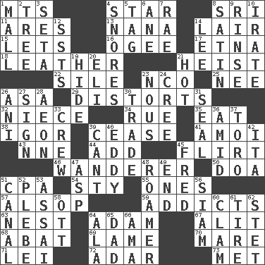 ACROSS 1. Mountains (abbr.) 4. Play the lead 8. Indian title of respect (Mr.) 11. Ancient Greek god of war 13. Nanny 14. Den 15. Allows 16. Double curve, resembling the letter S 17. Inactive volcano in Sicily 18. Cordwainer's material 21. Robbery 22. Drop; flow; fall 23. Non-commissioned officer (abbr.) 25. Born 26. White ___ sheet 29. What propaganda does 32. Sibling's daughter 34. Regret 35. Ingest 38. Russian composer Stravinsky 39. Desist 41. Mine, in Marseilles 43. Compass dir. 44. Say or write further 45. Talk or behave amorously 46. Roamer 50. ___ good deed 51. Accounting whiz (abbr.) 54. Filthy place 55. Washington bills 57. Columnist Joseph or Stewart 59. Inveterate users 63. Egg locale 64. First of billions? 67. Came down and settled, as after flight 68. Blind as ____ 69. Unable to walk 70. Female horse 71. Flowery wreath 72. The sixth month of the Jewish calendar 73. Was introduced to DOWN 1. Shopping center 2. Family _ (genealogy) 3. Bristle 4. Sounds asleep 5. Label 6. A saturated hydrocarbon 7. Actress Charlotte 8. Smooth fabric 9. Wash lightly 10. Feeling or showing extreme anger 12. Fast planes 14. Area sheltered from the wind 19. Flintstone garb 20. Biblical high priest 21. Being at a high temperature 23. Good sense 24. Algonquian 26. Cuckoo 27. Public display of a written message 28. Period of immesurable duration 30. Exchange 31. Lick closed 33. Ship's personnel 36. Among 37. "Corrida" creature 39. Patter 40. Whirlpool 42. Call ___ day 45. Flintstone 47. Cleo's killer 48. Wanderer 49. Conclude 51. Lessep's creation 52. Military trainee 53. Slender Brazilian palm 56. Thailand, formerly 58. Baseball player Mel 60. Dollar (slang) 61. Become fatigued 62. Proofreading order 64. According to 65. June honoree 66. Wet nurse (var.)