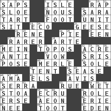 ACROSS 1. Plant excrements 5. Small island 9. Strike 12. A type of plum 13. Common sense 14. "Two Mules for Sister ____" 15. Small pie 16. 12 inches 17. A single undivided whole 18. Be seated 19. Environmental prefix 21. Honkers 22. French philosopher Descartes 24. Sliced dessert 26. Car or cant ending 27. More valued for its uncommonness 28. Johnson of "Laugh-In" 29. Count _ (2 wds.) 30. Traditional theme or motif 32. 1/640 square mile 36. Against 37. Solemn pledge 38. Indian titles of respect 39. Airs 40. Haggard of country music 42. Flatfish 43. Portable shelter 44. Gospel singer Marvin 46. Nursemaid (var.) 49. Raised railways 50. Opinion 51. Father Junipero _ 53. Regret 54. Soggy 57. Portico 58. Shade of tan 61. Hero or heavy, e.g. 62. Celtic language 63. A really long time 64. One of the Great Lakes 65. Born 66. A blast of a horn 67. Paradise DOWN 1. Fast planes 2. Jai ____ 3. Likenesses of persons 4. Put into a specified state 5. A message received and understood 6. "Barney Miller" actor Jack 7. Nilotic language 8. Eastern Standard Time (abbr.) 9. The wife of a rajah (variant) 10. Get up 11. Eucharist need 14. Take to court 19. Compass dir. 20. Foregone conclusion 21. Unit of force equal to gravity 23. Bert's buddy 24. Move like a hungry wolf 25. It is 27. Western Nevada city 28. To the left, to Queeg 29. Atlas unit 31. Baking chambers 32. Slender Brazilian palm 33. What you're doing now 34. Cause heat under the collar 35. Compass dir. 40. Cartoonist voice _ Blanc 41. Son of Isaac 43. Beverage made from leaves 45. First lady 46. NE Netherlands city 47. Distance measurement (Brit.) 48. Came up 52. Actress Charlotte 53. The smallest animal of a litter 55. Writer Wiesel 56. Adolescent 58. Erode 59. Corporate head (abbr.) 60. Friend of Pooh 61. Portuguese money of account (variant)