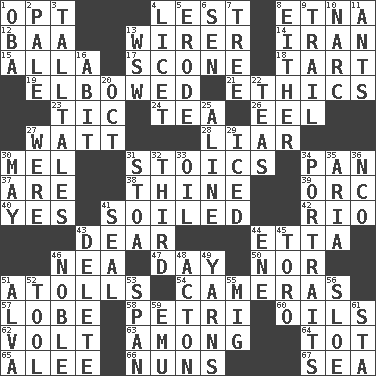ACROSS 1. Elect 4. For fear that 8. Inactive volcano in Sicily 12. Sound made by sheep 13. One who wires 14. SW Asia republic 15. Silent film actress Nazimova 17. Biscuitlike quick bread 18. Small pie 19. Shoved, as through a crowd 21. Moral principles 23. Nervous spasm 24. Beverage made from leaves 26. Snakelike fish 27. Electrical Unit 28. One who doesn't tell the truth 30. Cartoonist voice _ Blanc 31. Unemotional ones 34. Baking dish 37. "We ___ not amused" (Victoria) 38. One or ones belonging to thee 39. The grampus (Milton) 40. Affirmative reply 41. Dirtied 42. River (Sp.) 43. Letter starter 44. Singer James 46. Teachers' org. 47. 24 hours 50. And not 51. Ringlike coral islands and reefs 54. Devices for capturing images 57. Ear part 58. _ dish (used to culture cells) 60. Petroleums 62. Electrical Unit 63. Amid 64. Small child 65. Toward shelter 66. Religious women 67. Ocean DOWN 1. Chief or king in Benin or Nigeria 2. Diluted with white 3. Baron Munchausen's specialties 4. It is permitted: Lat. 5. Eat (away) 6. Elected rep. 7. Family _ (genealogy) 8. One or the other 9. Lag or linger behind 10. Drug cop 11. Pismires 13. Compass dir. 16. "This won't hurt ____!" 20. Sep. follower 22. Afternoon social gatherings 25. Place in a line 27. Past tense of be (plural) 29. On the rocks 30. Can I? 31. Portico 32. One of three equal parts 33. Petroleum 34. Likenesses of persons 35. Roberta Peters solo 36. Non-commissioned officer (abbr.) 41. Lick closed 43. Erase 44. Compass dir. 45. "Corrida" creature 46. Impressive in appearance 48. 13-14th century defensive garment 49. Tall tales 51. Inventor's middle name 52. Instrument 53. Connect, as a bridge 55. Russian fighter aircraft 56. A type of plum 59. Australian flightless bird 61. R.R. building