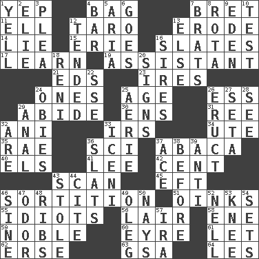 ACROSS 1. Slangy assent 4. Paper or plastic container 7. Cy Young winner Saberhagen 11. Pipe bend 12. Edible starchy tuberous root 13. Eat (away) 14. Falsehood 15. One of the Great Lakes 16. Chalkboards 17. Acquire or gain knowledge or skills 19. Aide 21. Begley and Asner 23. Angers 24. Washington bills 25. Grow older 26. Curvy letter 29. Stay 30. Followers of ems 31. Portuguese money of account (variant) 32. Cuckoo 33. Big collection agency 34. Shoshoni 35. Actress Charlotte 36. _-fi 37. Phillipine bananalike plant 40. Raised railways 41. Area sheltered from the wind 42. Penny 43. Glance over 45. Lizard (obsolete) 46. Decision 51. Pig sounds 55. Foolish or stupid persons 56. Den 58. Compass dir. 59. Impressive in appearance 60. Jane of fiction 61. Allow 62. Celtic language 63. Girls' org. (abbr.) 64. French article DOWN 1. Shout 2. Writer Wiesel 3. Entreaty 4. Tavern 5. Operatic vocal solo 6. Moves 7. Naughty children 8. Roll call or roster of names 9. Paradise 10. Trial 12. Watched over 13. Otherwise 16. Fathers 18. Painter Guido (1575-1642) 20. Attaches a signature 22. Compass dir. 24. Off-Broadway awards 25. Nest on high 26. Spew [out] 27. Stalk of a moss capsule 28. Observe 29. Of or related to the anus 32. "We ___ not amused" (Victoria) 33. Ancient Celtic tribe of eastern Britain 36. Narrow boards 37. Adept person 38. Prior to 39. Against 43. Fur scarf 44. Quote 46. Trig term 47. Scent 48. Teases 49. Cassini of fashion 50. Negative votes 52. 1994 drama film starring Jodie Foster 53. Leg joint 54. Puts into a specified state 57. Lyricist Gershwin