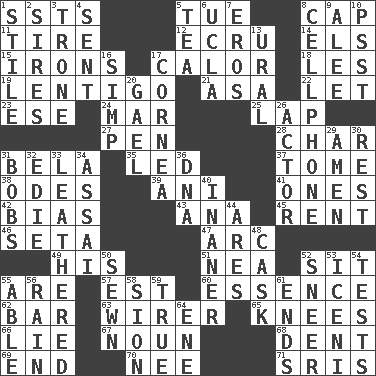 ACROSS 1. Fast planes 5. Third day of the wk. 8. Head covering 11. Become fatigued 12. Shade of tan 14. Raised railways 15. Metal shackles 17. Bodily heat indicating an inflammation 18. French article 19. Small, flat, pigmented spot on the skin 21. White ___ sheet 22. Allow 23. Compass dir. 24. Make imperfect 25. Infant locale 27. Writing instrument 28. Burn to charcoal 31. Actor Lugosi 35. Directed 37. Heavy book 38. Lyric poems 39. Black tropical American cuckoo 41. Singles 42. Prejudice 43. Santa ___, CA 45. Monthly bill 46. Bristle 47. Curve 49. Part of HMS, perhaps 51. Teachers' org. 52. Be seated 55. "We ___ not amused" (Victoria) 57. Eastern Standard Time (abbr.) 60. Substance 62. Oblong piece of solid material 63. One who wires 65. Leg joints 66. Whopper 67. Part of speech 68. Gouge 69. Conclude 70. Born 71. Indian titles of respect DOWN 1. Vertical member of a panel or frame 2. Founders of families 3. Heavy duty weighing machine 4. Emitted 5. Afternoon social gathering 6. Southern CA. univ. 7. Greek god of love 8. Portable communications device 9. Toward shelter 10. Inconspicuous attention getter 13. Mountain range 16. Simple or foolish person 17. Pupil covering 20. Highlander 26. Thespian 29. So be it 30. Repose 31. Moves up and down 32. Singer Brickell 33. Resembling or made to resemble leather 34. Slender Brazilian palm 36. Heredity factor (abbr.) 40. More lacking in sense or substance 44. Ancient Greek god of war 48. Keg 50. Stitched 52. Scornful expression 53. Ancient Celtic tribe of eastern Britain 54. Trials 55. Competent 56. Precipitation 58. The Jewish people; Israel 59. Loyal 61. Conclusions 64. Compass dir.