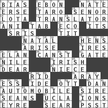 ACROSS 1. Prejudice 5. Inky black, to poets 9. Nathan's nickname 13. Celtic language 14. Edible starchy tuberous root 15. Sir (Sp.) 16. Globular water bottle used in Asia 17. Interpreter 19. Black tropical American cuckoo 20. Bar bill 21. Environmental prefix 22. ___ a Wonderful Life 23. Indian titles of respect 25. Teat (slang) 26. Brizilian seaport 30. Coop moms 34. Originate 35. Angers 36. Enthusiasm 39. 2nd pers. sing. pres. of can (arch.) 42. Yard entry 43. "Death on the ____" 44. From or relating to Ireland 46. Letter starter 47. Sibling's daughter 48. To free from 51. Like ___ of sunshine 54. Double-curved letter 57. Binary compound 58. Baseball player Mel 60. One of the 12 tribes of Israel 62. Form of transportation 65. Beget 66. Actors Connery and Penn 67. Southern CA. univ. 68. Charged atoms 69. Jane of fiction 70. Wither 71. Inconspicuous attention getter DOWN 1. Actor Lugosi 2. Removes the wrinkles 3. Being in motion 4. Ocean 5. Singer James 6. Sharp remark 7. Mouth or opening 8. Music written for nine 9. Teachers' org. 10. Against 11. A blast of a horn 12. Blunders 15. Position in a hierarchy or organization 18. _-fi 20. Russian ruler of old 24. More lacking in sense or substance 27. Nervous spasm 28. White ___ sheet 29. Soviet premier 1918-24 30. Having greater elevation 31. Epoch 32. Fish or hair follower 33. Compass dir. 36. Conclusion 37. Falsehood 38. According to 40. Indian title of respect (Mr.) 41. Make a knot 45. Scram! 48. Basketball hoops 49. Wedding promise 50. Alight from a bus 52. Goodbye (Sp.) 53. Tall tales 54. Comfort 55. Chop _ 56. Play the lead 58. Spanish pot 59. Rend 61. Egg locale 63. Single 64. Frozen water 65. Small drink
