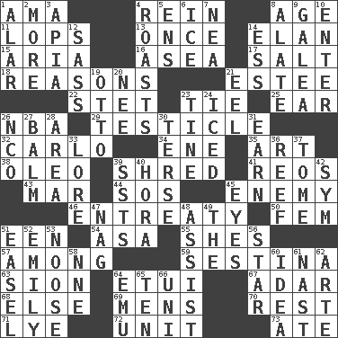 ACROSS 1. Nursemaid (var.) 4. It's straight from the horse's mouth 8. Mature 11. Chops off 13. Single time 14. Liveliness 15. Operatic vocal solo 16. At sea 17. Table seasoning 18. Thinks logically 21. First name in cosmetics 22. Proofreading order 23. Standoff 25. Ewer handle 26. Basketball assoc. 29. A testis 32. Monte _, Las Vegas Hotel/Casino 34. Compass dir. 35. Nonscientific branch of learning 38. Margarine 39. Fragment 41. Vintage cars 43. Impair 44. Distress signal 45. Foe 46. Plea 50. Opposite of masc. 51. Car or cant ending 54. White ___ sheet 55. "______ My Girl" (Turtles hit) 57. Amid 59. French poetic form 63. The Jewish people; Israel 64. Needle holder 67. The sixth month of the Jewish calendar 68. Otherwise 69. Not women's 70. Respite 71. Sodium hydroxide 72. A single undivided whole 73. Had dinner DOWN 1. Having or resembling wings 2. Greater amount 3. Capital of Western Samoa 4. Ridicules or criticizes harshly 5. Followers of ems 6. Frozen water 7. Teachers' org. 8. Having winglike extensions 9. An organ shaped like a helmet 10. Keyboard key 12. Backtalk 14. Double-curved letter 19. Von Bismarck 20. Born 21. Snakelike fish 23. Prong on a fork 24. On the rocks 26. Non-commissioned officer (abbr.) 27. Lip ointment 28. Type of rug 30. Laconic 31. Merit 33. Old wives' tales, e.g. 36. Coral collection 37. Heavy book 39. Fast planes 40. Israeli folk dance 42. Symbol (abbr.) 45. Snake ____ (dice throw) 47. Tired old horse 48. Aid 49. Definite Article 51. Artist's stand 52. Poet Dickinson 53. Trap for birds or small mammals 56. Play the lead 58. Compass dir. 60. The content of cognition 61. Political cartoonist Thomas 62. Johnson of "Laugh-In" 64. Australian flightless bird 65. Nine, plus one 66. Corn or form start