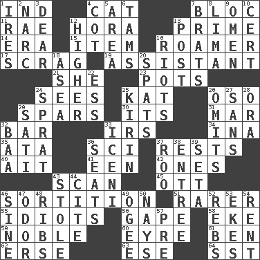ACROSS 1. Indiana (abbr.) 4. Domesticated feline 7. Group of countries in special alliance 11. Actress Charlotte 12. Israeli folk dance 13. A-one 14. Epoch 15. A whole individual unit 16. Nomad 17. Lean end of the neck 19. Helper 21. A female animal or person 23. Plant holders 24. Observes 25. Krazy ___ of comics 26. Bear (Spanish) 29. Practice fights 30. It is 31. Make imperfect 32. Oblong piece of solid material 33. Big collection agency 34. _ tizzy (2 wds.) 35. "One Day ___ Time" 36. _-fi 37. Musical pauses 40. Small island 41. Car or cant ending 42. Washington bills 43. Examine hastily 45. Baseball player Mel 46. Decision 51. More uncommon 55. Foolish or stupid persons 56. Yawn 58. Make supply last 59. Having high moral qualities 60. Jane of fiction 61. Benjamin's nick name 62. Celtic language 63. Compass dir. 64. Fast jet (abbr.) DOWN 1. Angers 2. Drug cop 3. Letter starter 4. Small bed 5. Length times width 6. Scottish caps 7. Naughty children 8. Pale green bean 9. Sign of things to come 10. Certainty 12. Having greater elevation 13. Mail 16. Disturbances 18. At sea 20. Arguments over trivial matters 22. Curvy letter 24. Small fatty European fish 25. Japanese brewing company 26. Leaves out 27. Without 28. Mouth or opening 29. Suttee (variant) 32. Sound made by sheep 33. Ancient Celtic tribe of eastern Britain 36. Theater features 37. Friend of Pooh 38. Main course 39. Bristle 43. Took without asking 44. Quote 46. Trig term 47. Aroma 48. Teases 49. Double curve, resembling the letter S 50. Negative votes 52. Confederate soldiers (slang) 53. Supplements with great effort 54. Monthly bill 57. Before (prefix)