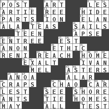 ACROSS 1. Mail 5. Tate display 8. French article 11. Nick name for Arthur 13. To sift 14. Flintstone garb 15. Components 16. Electrically charged atom 17. Enthusiasm 18. Insect wing 19. Afternoon social gatherings 21. Moves on water 22. Adolescent 24. Domed church section 25. Main course 27. Eastern Standard Time (abbr.) 29. Soon (poet.) 30. Moral principle 32. Painter Guido (1575-1642) 33. Arrive at 35. Dwelling 39. Glorify 41. _ the terrible 42. Cartoonist voice _ Blanc 43. Michaelmas daisies 45. Small Philippine buffalo 48. Having or resembling wings 49. Dice game 50. US Secretary of Labor Elaine L. _ 52. Automobile 55. For fear that 56. Observe 57. Dinah or Pauly 59. Pismires 60. Standoff 61. Dwellings 62. Fifth month 63. 100% 64. Trial DOWN 1. Dad 2. Taken by mouth 3. Ski resort town in Vermont 4. Teat (slang) 5. Roberta Peters solo 6. Vintage cars 7. "___ Little Indians" 8. Ms. Damita and namesakes 9. Peak District village in England 10. Elected reps. 12. First name in cosmetics 14. Pile 20. Compass dir. 21. Suttee (variant) 23. Bert's buddy 25. Hearing organ 26. Compass dir. 27. And so on (abbr.) 28. Quiet! 30. Ingest 31. Riviera of "Kiss of the Spider Woman" 33. Actress Charlotte 34. Pipe bend 36. Conquer 37. Spoil 38. Followers of ems 40. Dec. holiday 43. American Automobile Association (abbr.) 44. Splash clumsily 45. Sports stadium 46. Characterized by obscenity 47. Chooses 49. Burrowing marine mollusk 50. To provide with a ceiling 51. Person who is morally reprehensible 53. Ancient Greek god of war 54. Remainder 56. R.R. building 58. Being at a high temperature