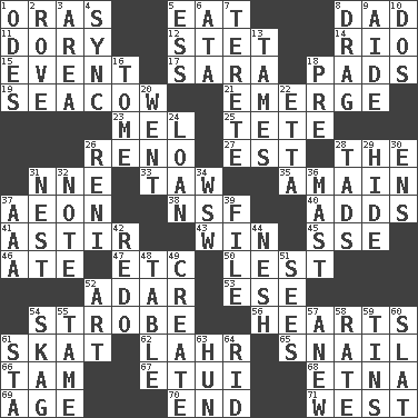 ACROSS 1. Mouths or openings 5. Consume 8. Male parent 11. Dinghy 12. Proofreading order 14. River (Sp.) 15. Happening 17. "Two Mules for Sister ____" 18. Groovy apts. 19. Manatee 21. Develop 23. Cartoonist voice _ Blanc 25. Wig 26. Former U.S. Attorney General Janet 27. Eastern Standard Time (abbr.) 28. Definite Article 31. Compass dir. 33. The 23rd letter of the Hebrew alphabet 35. At full speed 37. A really long time 38. Overdraft (abbr.) 40. Sums up 41. Being in motion 43. Victory 45. Compass dir. 46. Had dinner 47. And so on (abbr.) 50. For fear that 52. The sixth month of the Jewish calendar 53. Compass dir. 54. Disco prop 56. Centers 61. Three-handed card game 62. Cowardly lion portrayer 65. Slow-paced one 66. Scottish cap 67. Needle case 68. Inactive volcano in Sicily 69. Grow older 70. Conclusion 71. 270 degrees DOWN 1. Lyric poems 2. Be footloose 3. Length times width 4. Synchronize (abbr.) 5. Double-curved letter 6. _ moment's notice (2 wds.) 7. Cylindrical with tapered ends 8. To trail on the ground 9. Assistant 10. Two (Sp.) 13. Domesticates 16. Heavy book 18. Before (prefix) 20. Gone 22. Singer James 24. Grant temporary use of 26. Painter Guido (1575-1642) 28. Small amounts or degrees 29. Flintstone garb 30. Followers of ems 31. Egg locale 32. Observe 34. Compass dir. 36. Vertical spar for supporting sails 37. Auto club (abbr.) 39. Do some clerical work 42. Make new 44. Delicate 48. Eating place 49. Cause to be 51. Observes 52. Tate display 54. Heroin 55. Docile 57. Afresh 58. Pace 59. Canisters 60. Narrow board 61. R.R. building 63. Attila the _ 64. To free from