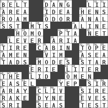 ACROSS 1. Waist strap 5. Mild oath, euphamism for damn 9. Cards in a Roman deck? 12. Type of rug 13. The content of cognition 14. Coop moms 15. Wander aimlessly 16. Aroma 17. Of or related to the anus 18. Fast jet (abbr.) 19. Mountains (abbr.) 21. Place in a line 22. Same (prefix) 24. Parent Teacher Assoc. 26. Fish or hair follower 27. Prying instrument 28. Operatic vocal solo 29. Become fatigued 30. Apartment or room in a ship 32. Drink excessively 36. So be it 37. Zeal 38. At sea 39. Small boys 40. Methods 42. Play the lead 43. 4th largest of the Great Lakes 44. 61 cubic inches 46. Definite Article 49. Flaplike covering 50. Presage 51. Artist's stand 53. Slangy assent 54. Title for a knight 57. Like ___ of sunshine 58. 154 in Roman numerals 61. Father 62. Libertine 63. Unit of force 64. Nights before holidays 65. Indian title of respect (Mr.) 66. Oceans 67. Trial DOWN 1. Drinking establishments 2. Greek god of love 3. Resembling or made to resemble leather 4. Scottish cap 5. "Vaya con ____" 6. Say or write further 7. Modern: prefix 8. Slender fish 9. Soviet premier 1918-24 10. Empty; void 11. Small island 14. Actor Linden 19. Madame (abbr.) 20. Torque (variant) 21. Auto club (abbr.) 23. Baking chambers 24. A-one 25. Metal container 27. Pale green bean 28. Stay 29. Make lace 31. Prevent from happening 32. Clothes sense 33. Clearly or manifestly demonstrative 34. Lightbulb-shaped fruit 35. Ewer handle 40. Medical imaging device (abbr.) 41. A type of plum 43. Pipe bend 45. Mischievous child 46. Separates forcefully 47. Ethiopian city, capital of Harari 48. 1973 Nobel Price Winner (Physics) Leo 52. Sight organ 53. Jacques Cousteau's middle name 55. Angers 56. Relief 58. Music discs 59. Potassium hydroxide 60. _ tizzy (2 wds.) 61. Arrange properly for use
