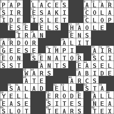 ACROSS 1. Infant food 4. Shoestrings 9. Having or resembling wings 13. Title for a knight 14. 1973 Nobel Price Winner (Physics) Leo 15. Root beer relative 16. Binary compound 17. Small island 18. Hoof sound 19. Compass dir. 21. Raised railways 22. White Person, in Hawaii 24. SW Asia republic 26. Followers of ems 27. Zeal 29. Came down and settled, as after flight 30. Honkers 31. Body of Kaffir warriors 33. Atmosphere 36. Period of immesurable duration 37. Legislator 40. _-fi 41. Fast jet (abbr.) 42. Pismires 43. Artist's stand 45. Armed conflicts 47. Tolerate 48. Had dinner 49. Arches 50. First course 52. Pipe bend 54. R.R. building 56. Shout 57. Eat (away) 59. 100% 61. Relaxation 62. Locates 63. Teachers' org. 64. Notch 65. Lacerates 66. John Ritter's dad DOWN 1. Air pressure measure (abbr.) 2. Assistant 3. Elected leader of a country 4. Flowery wreath 5. NE Netherlands city 6. Give a ring to 7. Supplements with great effort 8. Be seated 9. Buttonhole 10. Hang loosely or laxly 11. _ vera 12. Hit sharply and swiftly 20. Greek god of love 22. Sun: prefix 23. Black tropical American cuckoo 25. Ancient Greek god of war 27. Eras 28. Vintage cars 29. Tenement units (abbr.) 31. Lodging establishments 32. Floor covering 33. Helper 34. On the rocks 35. Cause heat under the collar 38. Having ears or earlike features 39. Located in or toward the back 44. Lettered men learn these first 45. Place for singles 46. _ moment's notice (2 wds.) 49. Tree or shrub in the Birch family 50. Lick closed 51. In addition 52. 4th largest of the Great Lakes 53. Globular water bottle used in Asia 55. Toward shelter 56. Consenting reply 57. Eastern Standard Time (abbr.) 58. Curvy letter 60. Not strict