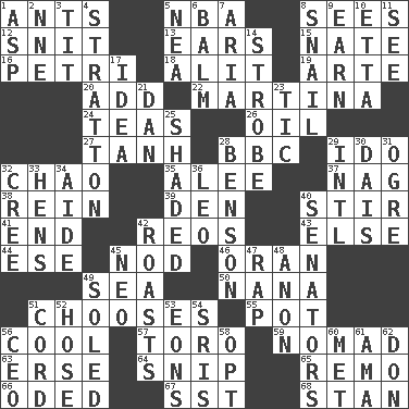 ACROSS 1. Pismires 5. Basketball assoc. 8. Observes 12. In a ____ (agitated or irritated) 13. Hearing organs 15. Nathan's nickname 16. _ dish (used to culture cells) 18. Came down and settled, as after flight 19. Johnson of "Laugh-In" 20. Say or write further 22. Chrissie's court nemesis 24. Afternoon social gatherings 26. Lubricate 27. Hyperbolic tangent 28. English channel? 29. Wedding promise 32. US Secretary of Labor Elaine L. _ 35. Toward shelter 37. Tired old horse 38. It's straight from the horse's mouth 39. Lair 40. Use a swizzle stick 41. Conclusion 42. Vintage cars 43. Otherwise 44. Compass dir. 45. Dreamland 46. Northwest Algerian city 49. Ocean 50. Nanny 51. Elects 55. Plant holder 56. Calm and collected 57. "Corrida" creature 59. Wanderer 63. Celtic language 64. Clip 65. San ____ (Riviera town) 66. Wrote a lyric poem 67. Fast jet (abbr.) 68. Comedian Laurel of Laurel & Hardy DOWN 1. Viper 2. Compass dir. 3. Teat (slang) 4. Ski resort town in Vermont 5. Teachers' org. 6. Lip ointment 7. Roberta Peters solo 8. Slow-paced one 9. Merit 10. Singer James 11. Observe 14. Disco prop 17. The main thing one is thinking about 21. Daniel's nick name 23. Nervous spasm 25. Cast a shadow over 28. Gillaume's butler role 29. International (abbr.) 30. Raised platform 31. Legendary monster 32. Algonquian 33. Coop moms 34. Helper 36. Lion 40. Legislators 42. Cooks with dry heat, as in an oven 45. Modern: prefix 47. Strike 48. At once, immediately (arch.) 49. Having a sole or soles 51. Drawstring 52. Flexible conduit 53. Immeasurably long periods of time 54. Indian titles of respect 56. Corporate head (abbr.) 58. Elect 60. Was introduced to 61. Nursemaid (var.) 62. Spanish title