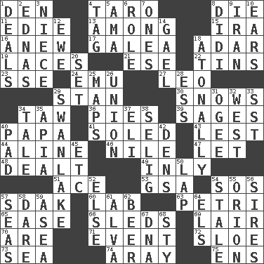 ACROSS 1. Lair 4. Edible starchy tuberous root 8. Pass on 11. Singer Brickell 13. Amid 15. Lyricist Gershwin 16. Afresh 17. An organ shaped like a helmet 18. The sixth month of the Jewish calendar 19. Shoestrings 21. Compass dir. 22. Airtight sealed metal containers 23. Compass dir. 24. Australian flightless bird 27. Lion 29. Comedian Laurel of Laurel & Hardy 30. Frozen precipitation (plural) 34. The 23rd letter of the Hebrew alphabet 36. Sliced desserts 39. Gurus 40. Dad 41. Having a sole or soles 43. For fear that 44. Place in a line 46. Mediterranean tributary 47. Allow 48. Started a card game 49. Inwardly 51. Adept person 53. Girls' org. (abbr.) 54. Distress signal 57. Neighbor of Neb. 60. Experiment locale 63. _ dish (used to culture cells) 65. Comfort 66. Bobsleighs 69. Den 70. "We ___ not amused" (Victoria) 71. Incident 72. A type of plum 73. Ocean 74. Like ___ of sunshine 75. Followers of ems DOWN 1. Allots cards 2. Ferber et al. 3. Sibling's daughter 4. Label 5. Wet nurse (var.) 6. Hero or heavy, e.g. 7. Singles 8. "You Light Up My Life" star Conn 9. SW Asia republic 10. Hearing organs 12. She-sheep 14. Highlander 18. Without tonality 20. Put into a specified state 25. Atlas contents 26. The state of being joined or united 28. Curvy letter 29. Tchaikovsky ballet 31. Double curve, resembling the letter S 32. 270 degrees 33. Fast jet (abbr.) 34. Falsehood 35. Capital of Western Samoa 37. Biblical high priest 38. Major League Baseball Commissioner Bud 40. Groovy apt. 42. Hiding places for outlaws 45. And so on (abbr.) 50. Infant locale 52. Otherwise 54. Having lost freshness 55. Greek mythologigal hunter 56. Male parents of animals 57. Oceans 58. Have the gumption 59. At sea 61. Inventor's middle name 62. Fermented drink made from hops 64. Raised railways 67. Heredity factor (abbr.) 68. Filthy place