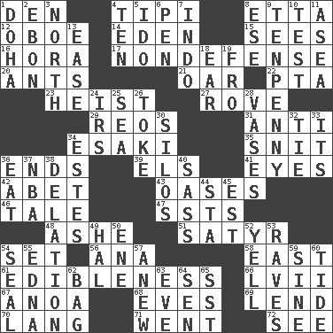 ACROSS 1. Lair 4. Native american tent (variation) 8. Singer James 12. Mitch Miller's instrument 14. Genesis locale 15. Perceives with the eye 16. Israeli folk dance 17. Unrelated to defense, as in spending 20. Pismires 21. Boat paddle 22. Parent Teacher Association (abbr.) 23. Robbery 27. Be footloose 29. Vintage cars 31. Opposed to 34. 1973 Nobel Price Winner (Physics) Leo 35. In a ____ (agitated or irritated) 36. Conclusions 39. Raised railways 41. Sight organs 42. Collude with 43. Fertile tracts in a desert 46. Falsehood 47. Fast planes 48. American tennis player Robert 51. Letch 54. Arrange properly for use 56. Santa ___, CA 58. 90 degrees 61. The property of being fit to eat 66. 57 in ancient Rome 67. Small Philippine buffalo 68. Nights before holidays 69. Grant temporary use of 70. Austrian-born American filmmaker Fritz 71. Left 72. Observe DOWN 1. Capital of the state of Qatar 2. Inky black, to poets 3. 0 degrees 4. Nine, plus one 5. Wedding promise 6. Fenced enclosure 7. _ china 8. Compass dir. 9. 3-inch nail 10. Trial 11. Toward the sea 13. Comfort 18. Ewer handle 19. Back 24. Big collection agency 25. Ocean 26. Casino tip 28. Flower holders 30. Grain storage towers 32. Make a knot 33. ___ a Wonderful Life 34. _____ Park, CO 36. Erode 37. Basketball assoc. 38. Accusation by an informer 40. Backtalk 44. R.R. building 45. Eastern Standard Time (abbr.) 49. Actor Linden 50. Compass dir. 52. Shout 53. All-night dance parties 54. Lick closed 55. Pulitzer Prize-winning author Ferber 57. Afresh 59. Trig term 60. Periodic rise and fall of the sea level 62. Container for groceries 63. First lady 64. Elected rep. 65. Fast jet (abbr.)