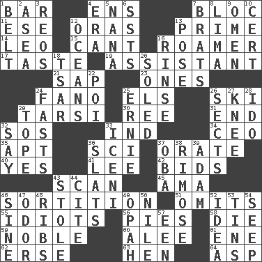 ACROSS 1. Drinking establishment 4. Followers of ems 7. Alliance 11. Compass dir. 12. Mouths or openings 13. First class 14. Lion 15. Patter 16. Nomad 17. Clothes sense 19. Aide 21. Plant excrement 23. Washington bills 24. Papal veil 25. Raised railways 26. What Jean-Claude Killy likes to do 29. Tarsus (plural) 30. Portuguese money of account (variant) 31. Conclusion 32. Mayday 33. Indiana (abbr.) 34. Corporate head (abbr.) 35. Fitting 36. _-fi 37. Declaim 40. Consenting reply 41. Area sheltered from the wind 42. Auction offers 43. Glance over 45. Nursemaid (var.) 46. Conclusion 51. Leaves out 55. Foolish or stupid persons 56. Sliced desserts 58. Pass on 59. Having high moral qualities 60. Toward shelter 61. Compass dir. 62. Celtic language 63. Layer 64. Cleo's killer DOWN 1. Waist strap 2. At sea 3. Vintage cars 4. Period 5. Grandmother 6. Fast planes 7. Naughty children 8. Pale green bean 9. Sign of something about to happen 10. Foregone conclusion 12. Seas 13. Introduce or present, as a question 16. Remove soap 18. Russian ruler of old 20. Having a sole or soles 22. Luau course 24. Goes without food and/or water 25. Bert's buddy 26. Religious groups 27. Leg joint 28. Wedding promise 29. Drink excessively 32. Declare 33. Ancient Celtic tribe of eastern Britain 36. Narrow boards 37. Chief or king in Benin or Nigeria 38. Full of chinks, cracks, or crevices 39. First man 43. Took without asking 44. Quote 46. Trig term 47. Aroma 48. Chest bones 49. Brightly colored fish 50. The longest river in the world 52. It may be bright or harebrained 53. Metal containers 54. Ooze 57. Car or cant ending