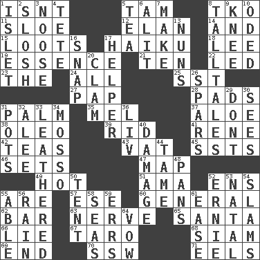 ACROSS 1. Is not 5. Scottish cap 8. Ring climax 11. A type of plum 12. Enthusiasm 14. Plus 15. Plunders 17. Japanese poetic form 18. Area sheltered from the wind 19. Gist 21. "___ Little Indians" 22. Directed 23. Definite Article 24. Everything 25. Fast jet (abbr.) 27. Infant food 28. Writing tablets 31. Inside of hand 35. Cartoonist voice _ Blanc 37. Medicinal plant 38. Butter sub 39. To free from 41. French philosopher Descartes 42. Afternoon social gatherings 43. Large container 45. Fast planes 46. Puts into a specified state 47. Atlas unit 49. Being at a high temperature 51. Nursemaid (var.) 52. Followers of ems 55. "We ___ not amused" (Victoria) 57. Compass dir. 60. Commissioned military rank 62. Oblong piece of solid material 63. Effrontery 65. Before Barbara or Clara 66. Untruth 67. Pacific island yam 68. Thailand, formerly 69. Conclude 70. Compass dir. 71. Snakelike fish DOWN 1. Small island 2. Make a splashing sound 3. Trap for birds or small mammals 4. False hair 5. Afternoon social gathering 6. Came down and settled, as after flight 7. Create 8. Baron Munchausen's specialties 9. Leg joint 10. Wrote a lyric poem 13. Religious women 16. Fastener 17. Aide 20. Burrowing marine mollusk 26. Practice fights 29. Do not 30. Observes 31. Plant holders 32. Toward shelter 33. Tough but pliablecoriaceous 34. With motion or animation 36. 54 in ancient Rome 40. Break 44. Docile 48. Baking dishes 50. Portable shelter 52. Bert's buddy 53. Relating to or accompanying birth 54. Criticizes harshly 55. Competent 56. Water falling in drops from the sky 58. Oceans 59. Blunders 61. Relaxation 64. Solemn pledge