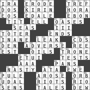 ACROSS 1. Lyricist Gershwin 4. Eat (away) 9. Not kosher 13. Two (Sp.) 14. Japanese brewing company 15. Israeli folk dance 16. Greek goddess of the dawn 17. Peak District village in England 18. Inky black, to poets 19. Teat (slang) 21. Pipe bend 22. Fertile tracts in a desert 24. Oceans 26. One more than two 27. Carrier 29. Conclusions 30. Empty; void 31. Path through which fluid escapes 33. Music discs 36. Lair 37. Contrary to your interests or welfare 40. To sift 41. Eastern Standard Time (abbr.) 42. Petroleums 43. Heavy duty weighing machine 45. Needle holder 47. Trials 48. American Automobile Association (abbr.) 49. Zero-star reviews 50. Difficult 52. _ moment's notice (2 wds.) 54. She-sheep 56. Whimper 57. Came up 59. Globe 61. Allodial 62. Disturbances 63. _ de Janeiro 64. Elected reps. 65. Stories 66. Morning condensation DOWN 1. Binary compound 2. Carrot, for example 3. Aide 4. Make supply last 5. Amusement-park features 6. Taken by mouth 7. Deli pickle 8. Compass dir. 9. College paper 10. Loose flowing garment 11. Greek god of love 12. Avid follower 20. Adolescent 22. Pig sounds 23. Assist 25. Length times width 27. Event that recurs at intervals 28. Washington bills 29. Hearing organs 31. 57 in ancient Rome 32. Snakelike fish 33. What you're doing now 34. Undesirable depression on a surface 35. Perceives with the eye 38. A city in N France, SE of Calais 39. Singer James 44. French philosopher Descartes 45. Artist's stands 46. Make lace 49. Thick mixture 50. Unadorned 51. Actor Alda or Thicke 52. Operatic vocal solo 53. Implement 55. One of the Great Lakes 56. Product of festering 57. Tate display 58. Curvy letter 60. Arrow shooter