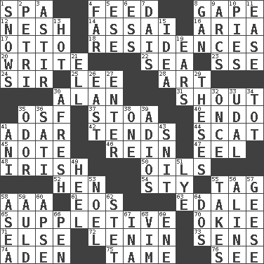 ACROSS 1. Health resort 4. Nourish 8. Open wide 12. Tender 14. Slender Brazilian palm 16. Roberta Peters solo 17. Von Bismarck 18. Homes 20. Compose 22. Ocean 23. Compass dir. 24. Title for a knight 25. Area sheltered from the wind 28. Tate display 30. Actor Alda or Thicke 31. Yell 35. Order of Saint Francis (abbr.) 37. Portico 40. Inside; within (prefix) 41. The sixth month of the Jewish calendar 42. Watches over 44. Leave at once 45. Brief written record 46. It's straight from the horse's mouth 47. Snakelike fish 48. From or relating to Ireland 50. Lubricates 52. Layer 54. Filthy place 55. Label 58. Auto club (abbr.) 61. Greek goddess of the dawn 63. Peak District village in England 65. Supplying deficiencies 70. Migrant worker of the '30s 71. Otherwise 72. Soviet premier 1918-24 73. Elected reps. 74. An important port of Yemen 75. Not wild 76. Observe DOWN 1. Overwhelms 2. _ dish (used to culture cells) 3. Moving or stirring 4. At a great distance 5. Compass dir. 6. Double-curved letter 7. Raised platform 8. Separate the seeds from cotton 9. Arches 10. Sliced desserts 11. Comfort 13. Being at a high temperature 15. The content of cognition 19. Hearing organs 21. Pipe bend 26. Compass direction 27. Keyboard key 29. College papers 30. Anew 32. At one time in the past 33. Allodial 34. Small child 35. Aroma 36. Suttee (variant) 38. Single 39. Goodbye (Sp.) 41. Cuckoo 43. In a ____ (agitated or irritated) 49. The bottom of a shoe or boot 51. Sodium hydroxide 53. Christmas carol 55. Receives possession of 56. Place in a line 57. Honkers 58. Toward the sea 59. Old (Scot.) 60. Domed church section 62. Proofreading order 64. Two (Sp.) 66. Animal enclosure 67. _ tizzy (2 wds.) 68. Zeal 69. Compass dir.