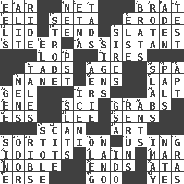 ACROSS 1. Ewer handle 4. Remaining after all deductions 7. Naughty child 11. Connecticut Ivy Leaguer 12. Bristle 13. Wear away 14. Hat (slang) 15. Look after 16. Chalkboards 17. Bull 19. Helper 21. Chop off 23. Angers 24. Bar bills 25. Personal question 26. Health resort 29. French painter Edouard 30. Followers of ems 31. Pet locale 32. Set 33. Big collection agency 34. The first octave above the treble staff 35. Compass dir. 36. _-fi 37. Catches 40. Double-curved letter 41. Area sheltered from the wind 42. Elected reps. 43. Examine hastily 45. Nonscientific branch of learning 46. Decision 51. Putting into practice 55. Foolish or stupid persons 56. (Had) reclined 58. Third mo. 59. Having high moral qualities 60. Conclusions 61. _ moment's notice (2 wds.) 62. Celtic language 63. Thick or sticky substance 64. It is so DOWN 1. Snakelike fish 2. Came down and settled, as after flight 3. Travel on an animal 4. Born 5. Inactive volcano in Sicily 6. Bits 7. Naughty children 8. Roll call or roster of names 9. Arabian gulf 10. Trial 12. Disco prop 13. Otherwise 16. Titles for men of rank and authority 18. Liveliness 20. Attaches a signature 22. Pacific Standard Time (abbr.) 24. Stories 25. Nest on high 26. Broad, flat, thick pieces 27. Friends 28. Fitting 29. Not women's 32. Turn to the right 33. Ancient Celtic tribe of eastern Britain 36. Narrow boards 37. Girls' org. (abbr.) 38. Summer TV shows 39. Pismires 43. Fur scarf 44. Quote 46. Trig term 47. Scent 48. Chest bones 49. Cassini of fashion 50. Billionth: prefix 52. "If ____ say so..." 53. Nathan's nickname 54. Pate de foie ____ 57. Wedding promise